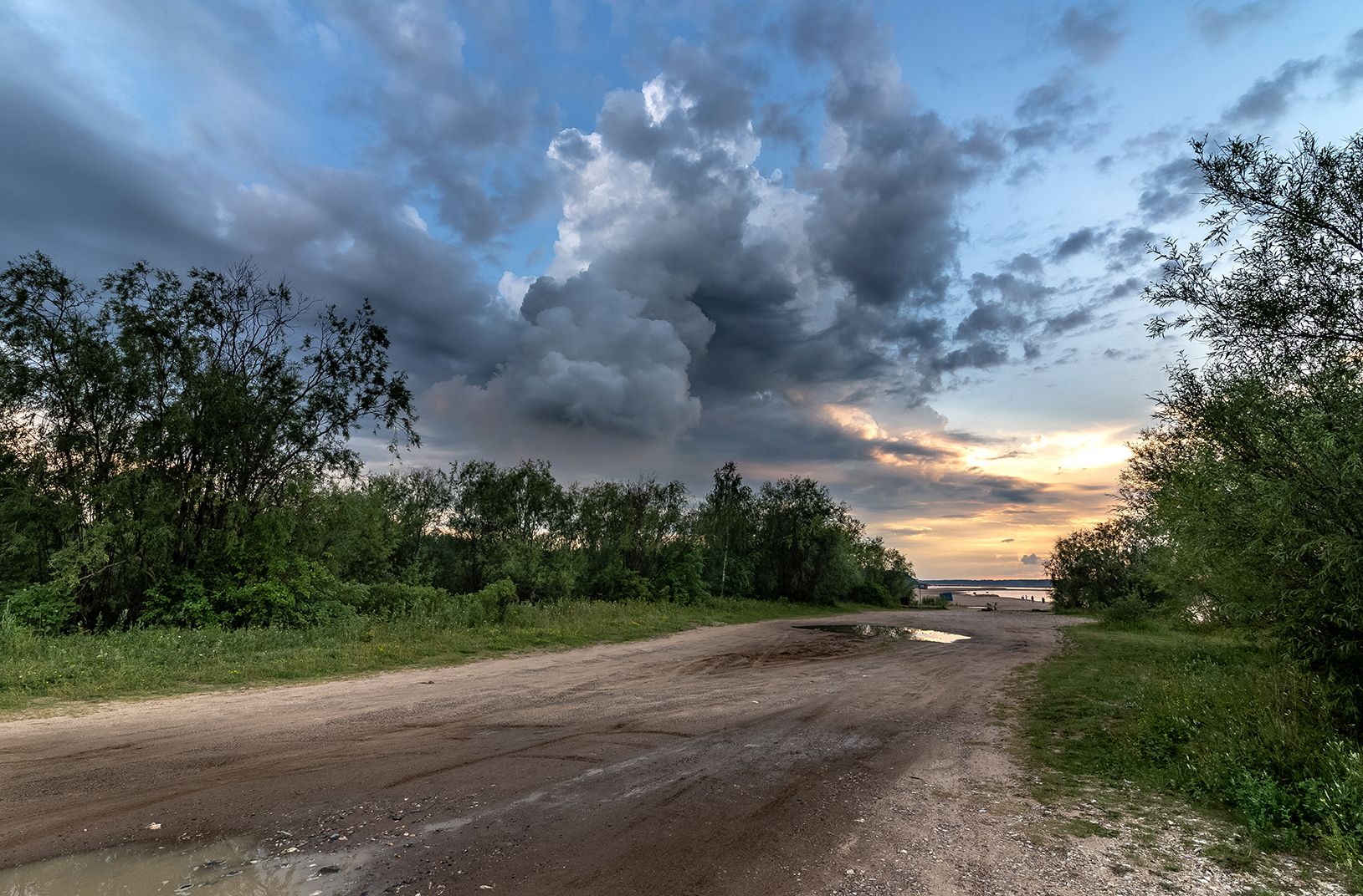 дорога, туча, пляж, даль, река, гроза, лужа, трава, кустарник., Анкудинов Леонид