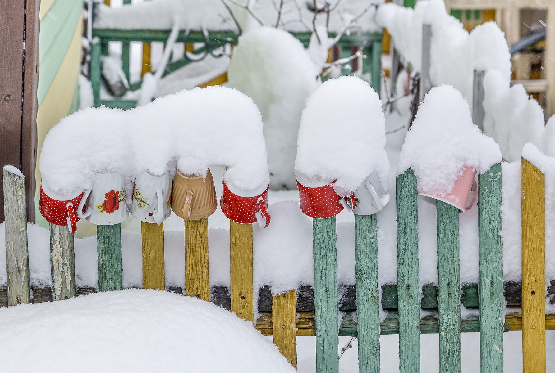 чашки, снег, изгородь,забор., Анкудинов Леонид