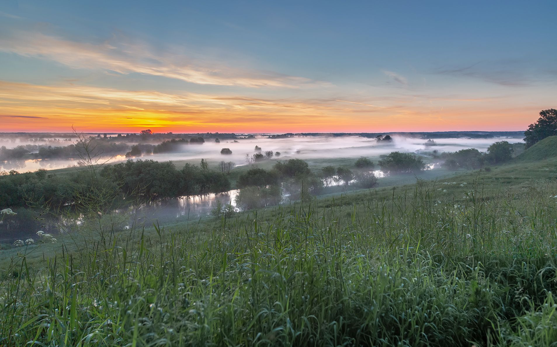 утро, туман, низина, трава, поле, восход, речка, кустарник, Анкудинов Леонид