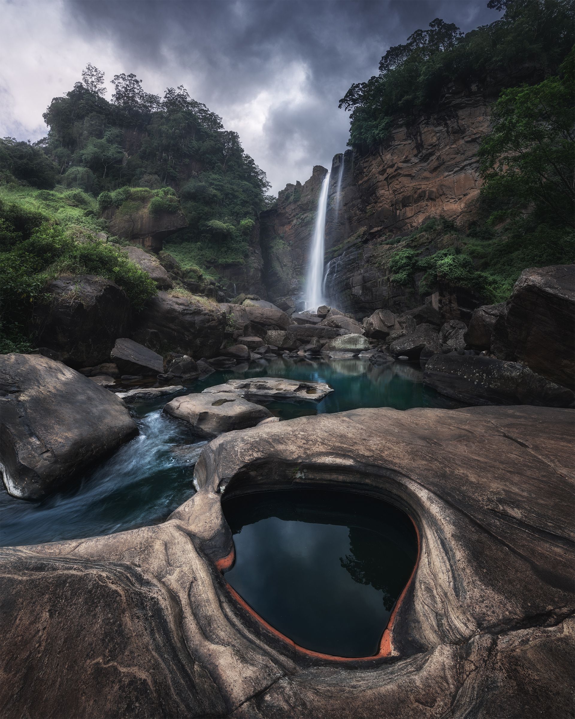 Водопад Лаксапана в горах Шри-Ланки поражает своей первозданной красотой. Струя воды падает с высоты в зелёный бассейн, образованный гранитными уступами. Вокруг — густые тропические заросли и мокрые скалы, отражающие небо. Кадр передаёт мощь и уединённость дикой природы. Фотография Анны Политовой запечатлела момент, когда природа кажется одновременно дикой и гармоничной.