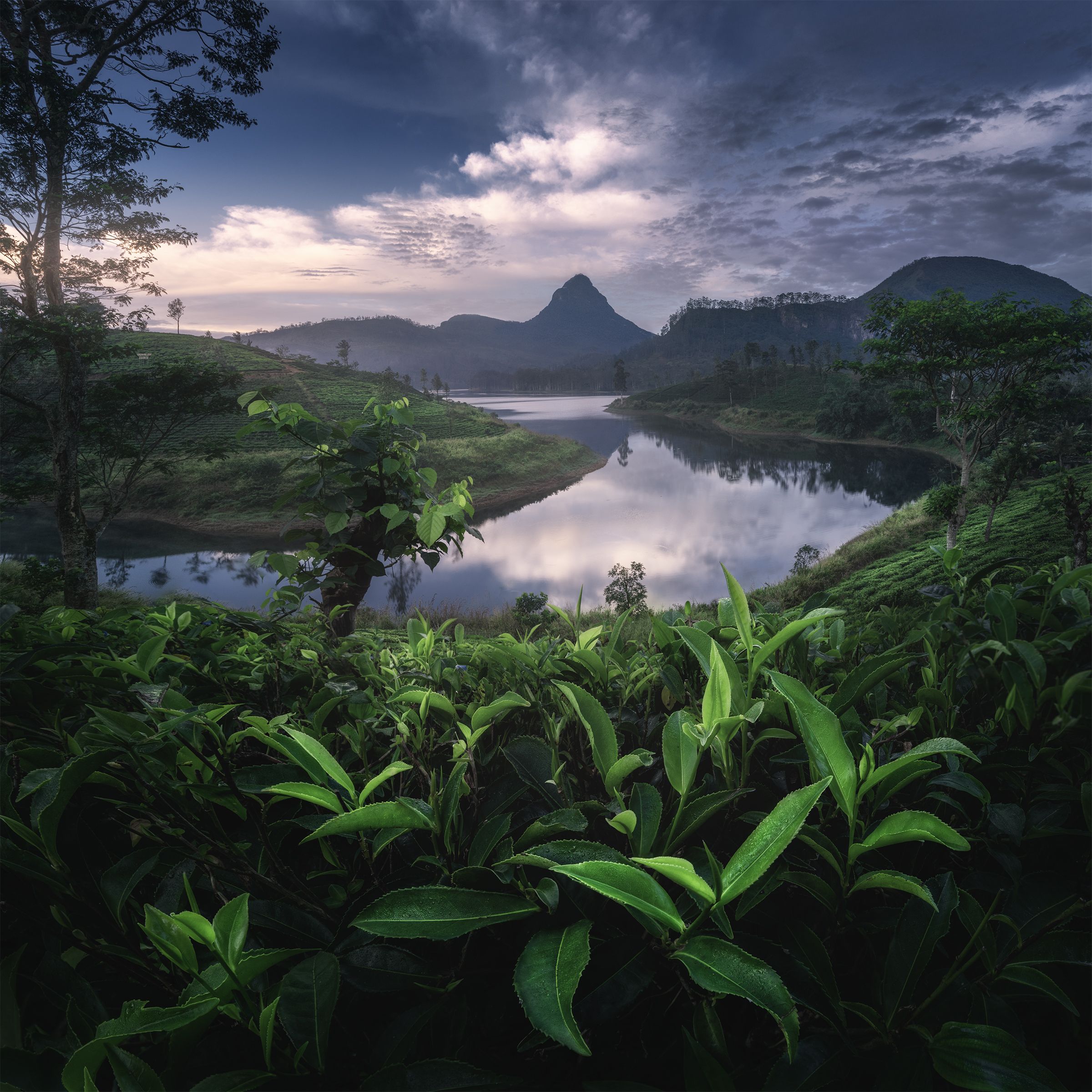 Тишина утра на Цейлоне — это симфония природы: шелест листьев, шорох воды и тихий свет, пробивающийся сквозь кроны. Река, словно серебряная лента, вьётся между зелёными холмами, а вдали — грандиозные горы, окутанные дымкой. Чайные кусты в переднем плане — живое дыхание земли, напоминающее о богатстве и умиротворении этого уголка мира. Каждый элемент сцены — от отражений в воде до тени на листьях — говорит о гармонии и вечном цикле природы.