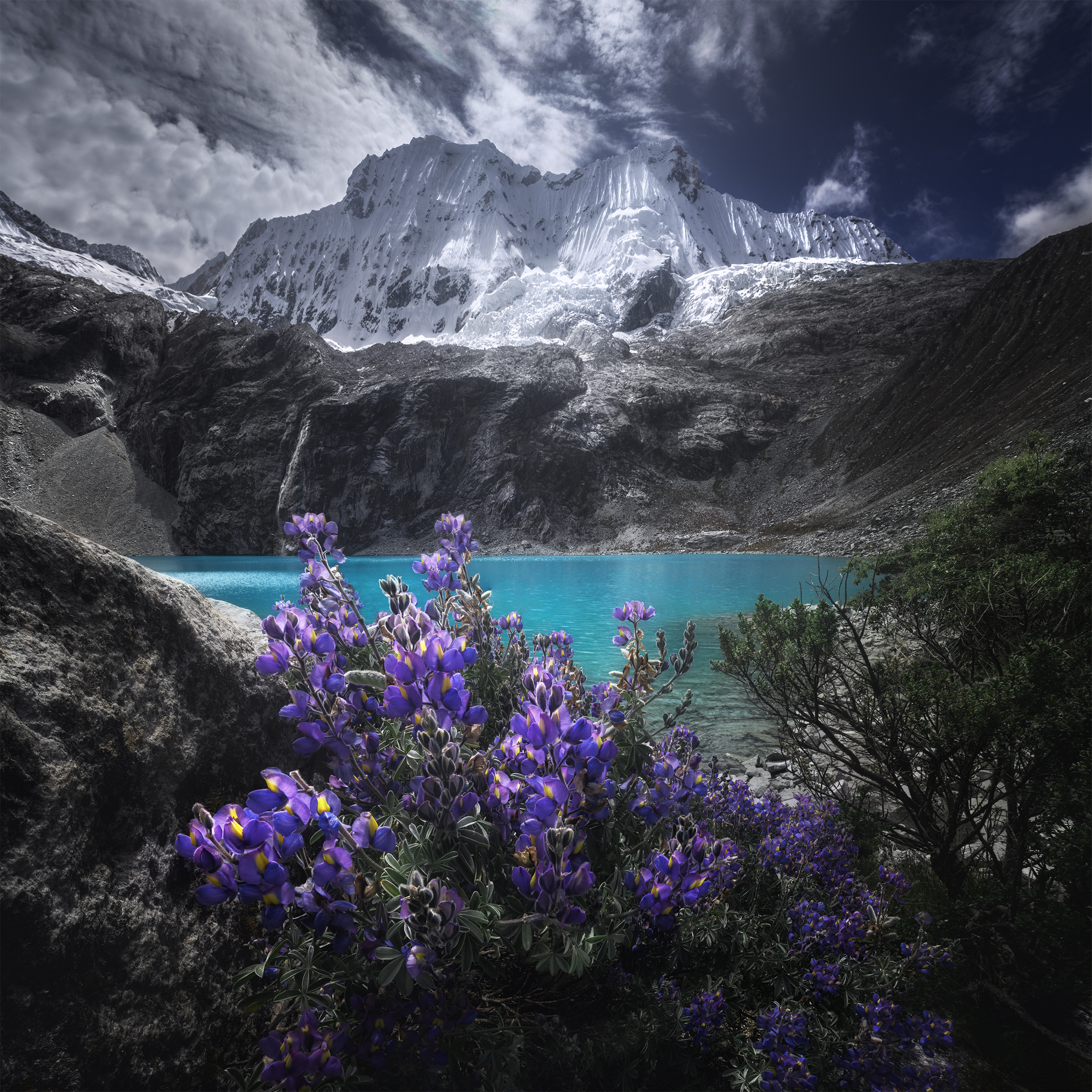 В глубине Анд, у подножия ледника, раскинулось озеро Laguna 69. Его бирюзовые воды отражают величественные скалы, а на переднем плане — яркие фиолетовые цветы, придающие сцене живость. Снимок передаёт гармонию дикой природы и её неповторимую красоту.