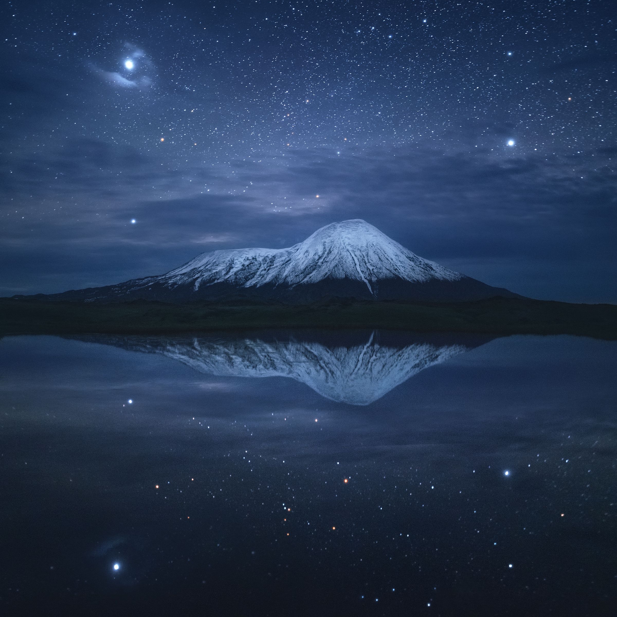 В тишине ночи, под бескрайним звёздным сводом, гора возвышается, словно страж древнего мира. Её снежный пик, отражённый в безмятежной глади озера, создаёт впечатление вечности. Каждая звезда — как светящийся шёпот Вселенной, а вода — её зеркало, где реальность и мечта сливаются. Это не просто пейзаж — это мгновение, где человек ощущает себя частью чего-то бесконечного.
