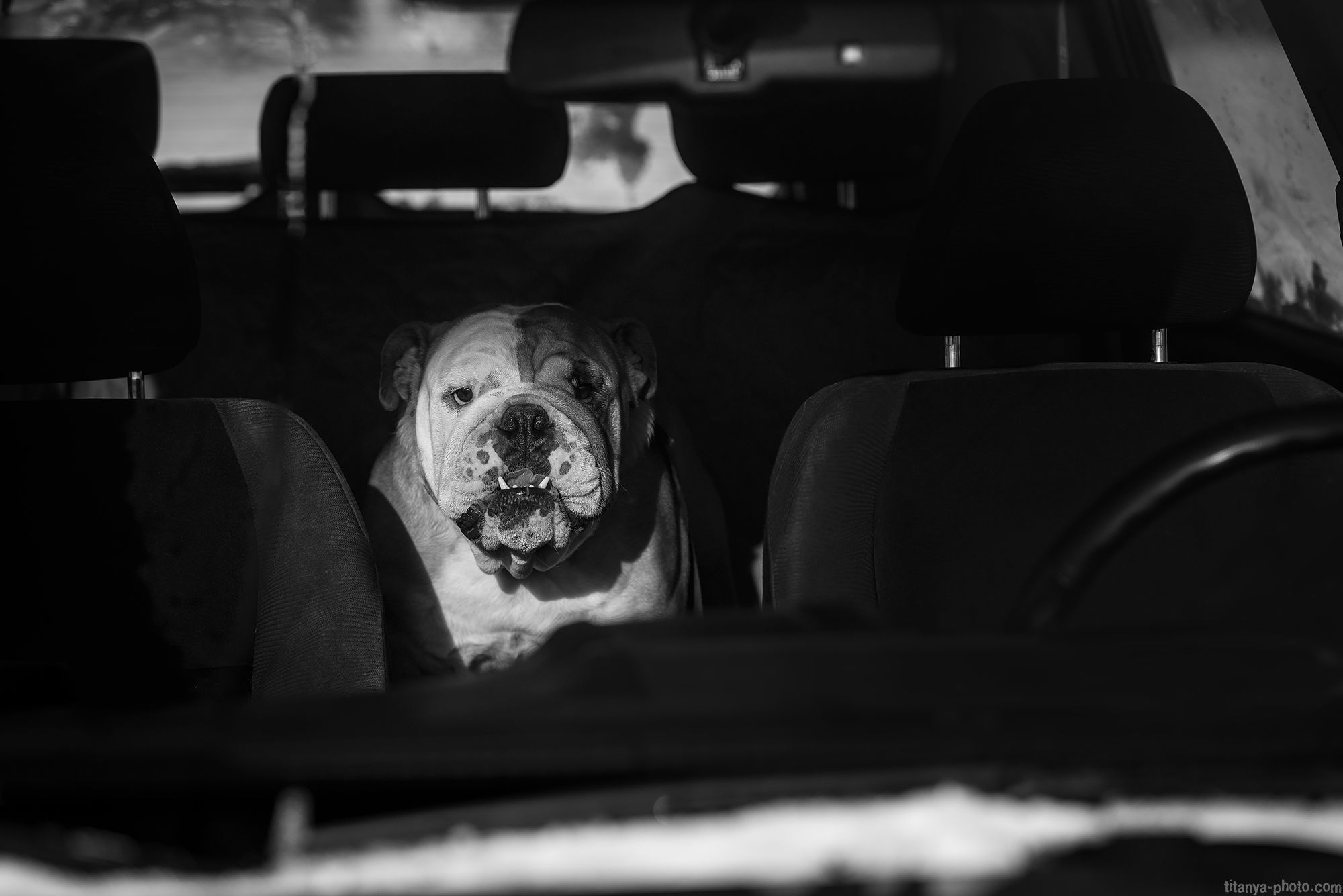 бульдог, портрет, чб, черно-белое, машина, автомобиль, собака, Анна Титова