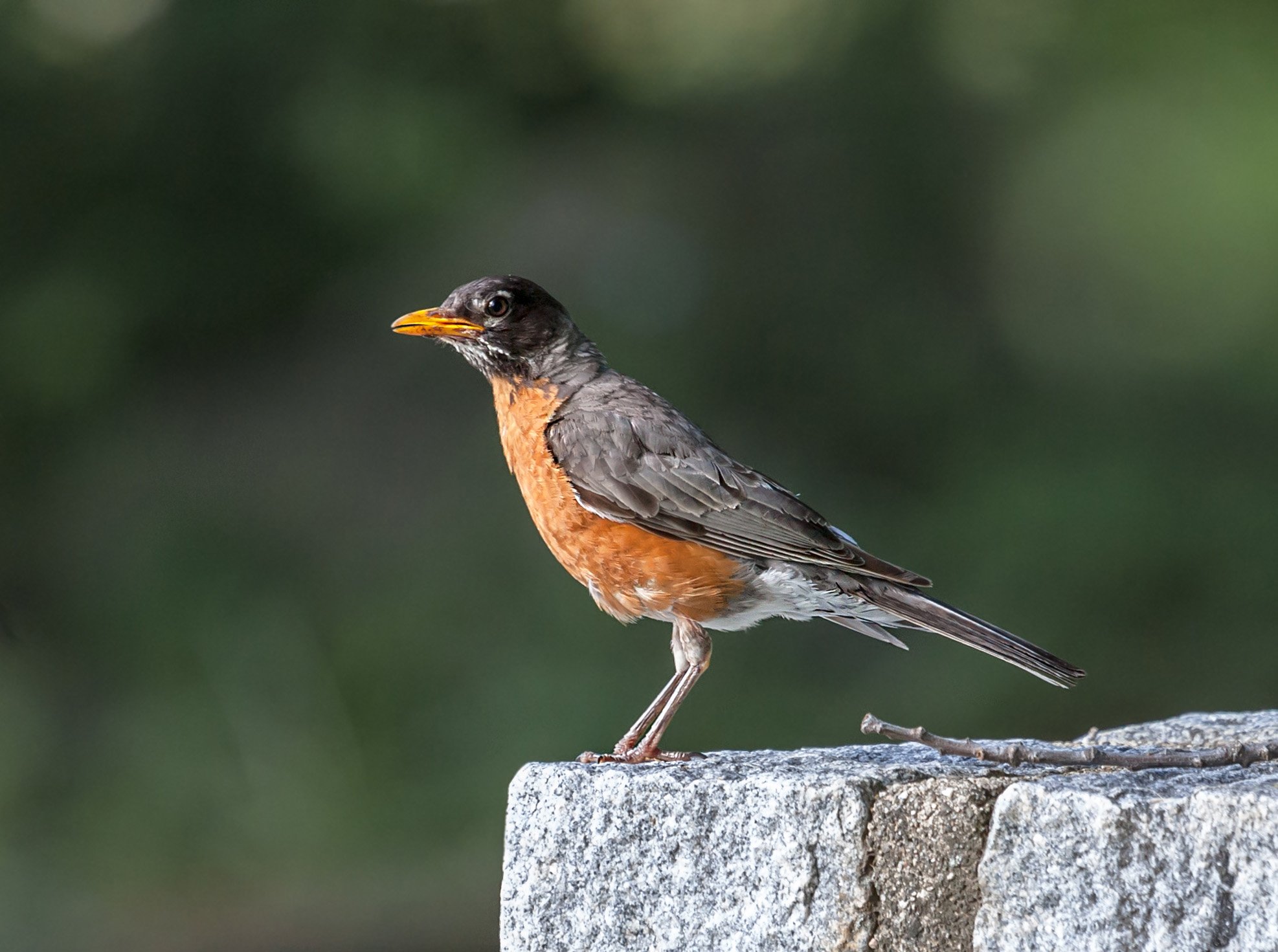 Странствующий дрозд.Робин.American Robin.Эта птица очень дорога всем канадцам и американцам - ведь она возвещает весну! Если бы в Канаде был бы аналог картины Сурикова «Грачи прилетели», то она бы называлась «Робины прилетели» - потому что все знают – если робин запел свою веселую песенку «cheer up, cheer up» – то это значит - зиме конец. Робин своим размером и розово-оранжевой грудкой похож на нашего снегиря, только клюв у него подлиннее и повадками он ближе к скворцам. Робины постоянно в трудах – охотятся за жучками и червячками на всех Ванкуверских лужайках. Хотя для взрослых птиц часть диеты – это фрукты и ягоды, но птенцы выкармливаются, в основном, вредными для растений гусеницами, жуками и личинками. В день птица потребляет до 100 граммов всякой мелкой живности. Тут и открывается секрет робина – он мигрирует на север с приходом тепла, потому что он может находить пищу, только когда оттает земля.