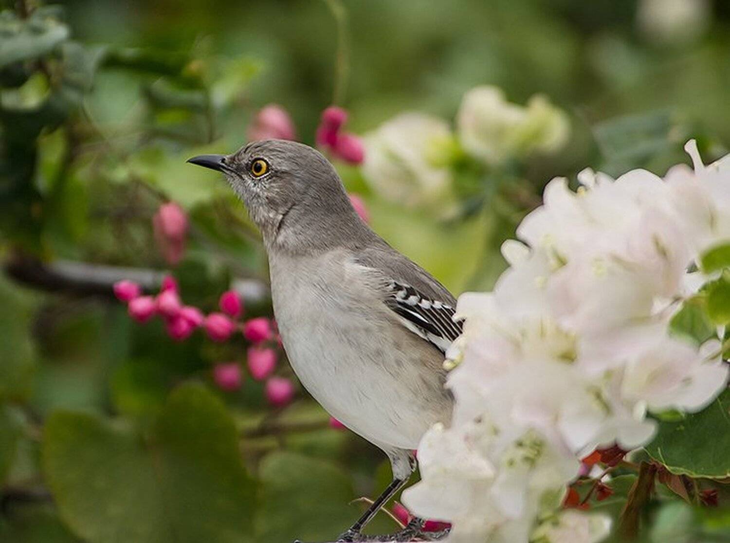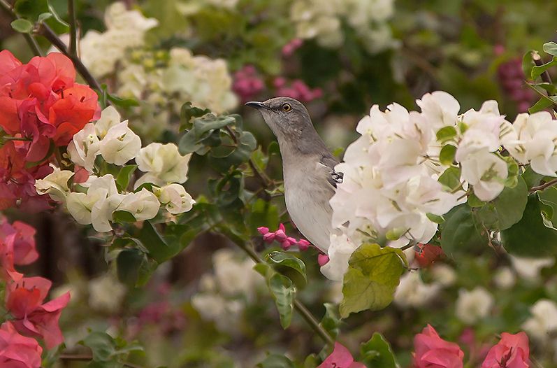Пересмешник (Northern Mockingbird).Певчий пересмешник.Приспособившись к жизни в больших городах, он мастерски подражает многим городским звукам.Среда обитания. Североамериканский певчий пересмешник широко распространен в южной части США, Мексике, на Кубе и Багамских островах.Пересмешник невелик, но храбрости ему не занимать. Он любит подразнить кошек и собак, а в сезон гнездования яростно охраняет свой участок и колотит клювом даже человека, если тот окажется поблизости от гнезда. Невольными «жертвами» атак пересмешника часто становятся жители Флориды.Пересмешник способен запомнить и искусно имитировать около 20 звуков — от звонка будильника до полицейской сирены или шума проезжающих автомобилей.