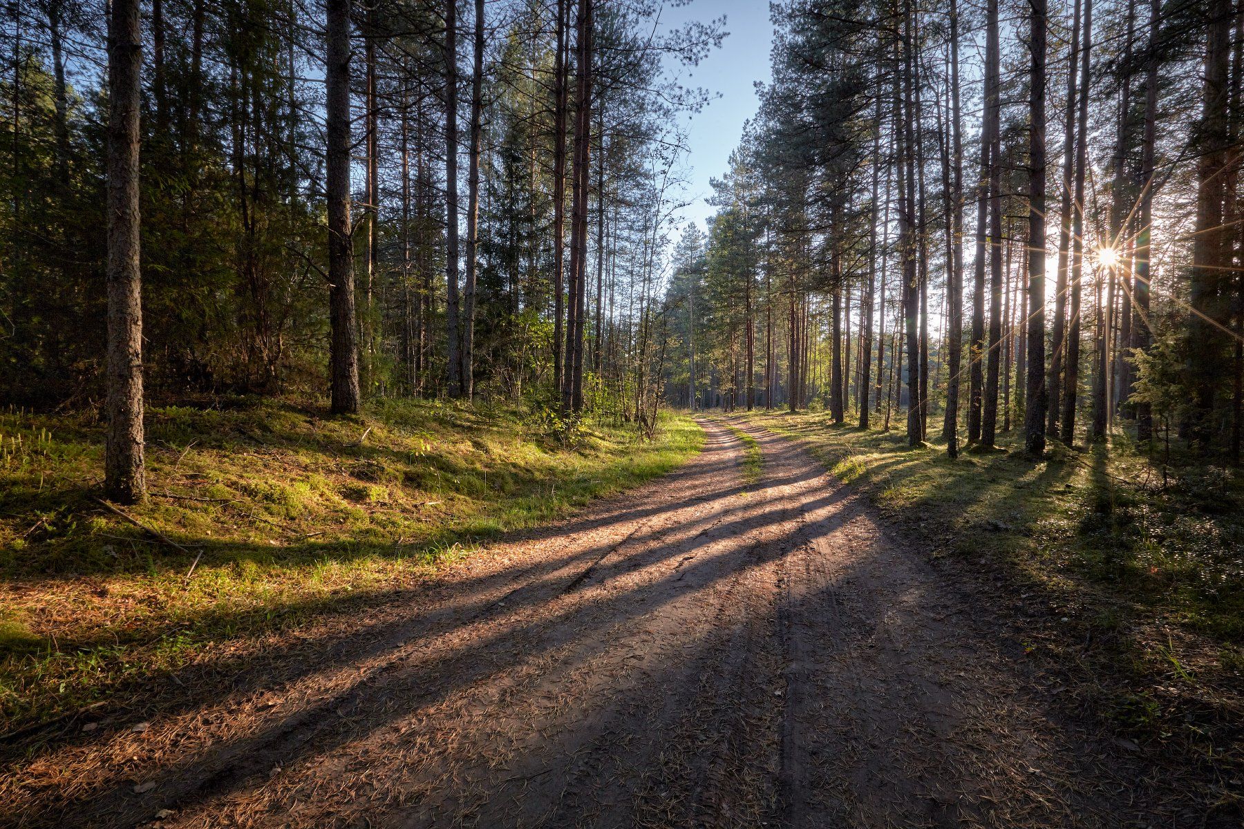 дорога, сосны, лес, солнце, тени, Антон Кононов