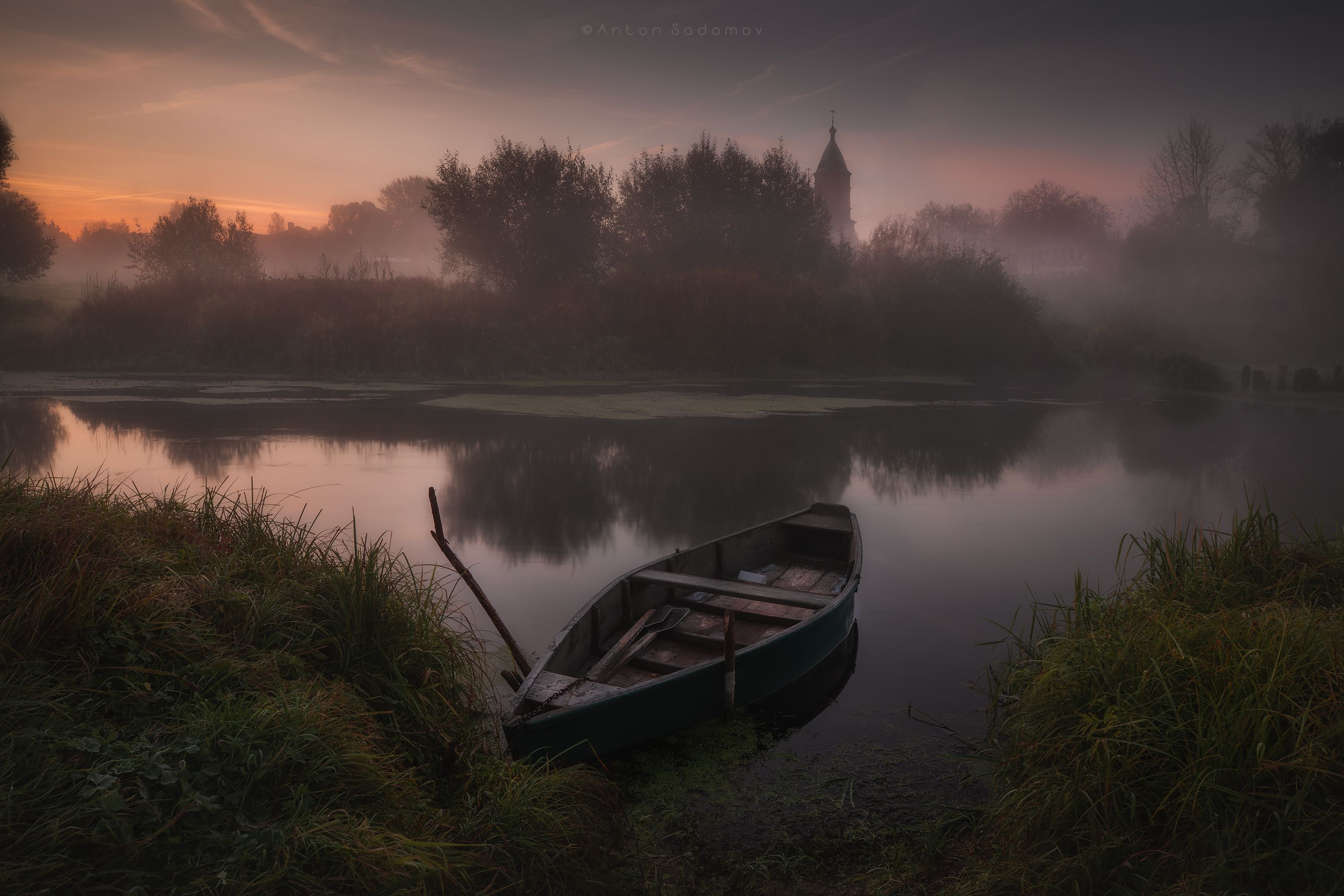 На рассвете река окутана густым туманом, отражающим небо в тёплых розовых и серых тонах. Старая деревянная лодка стоит у берега, словно забытая. Вдали сквозь дымку виднеются силуэты деревьев и колокольни — признаки близкой деревни. Сцена передаёт ощущение утренней тишины и покоя, когда мир только просыпается. Фотография Антона Садомова запечатлела мгновение, когда природа и человеческое присутствие сливаются в едином дыхании.