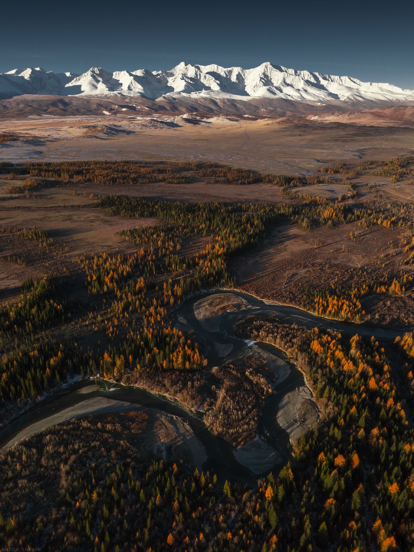 На фотографии запечатлен живописный осенний пейзаж, снятый с высоты птичьего полета. Извилистая река прорезает долину, покрытую деревьями с желто-оранжевой листвой. Вдали возвышаются величественные снежные горы под ясным небом. Фотограф Антон Шваин мастерски передал контраст между теплыми тонами осени и холодными оттенками горных вершин.