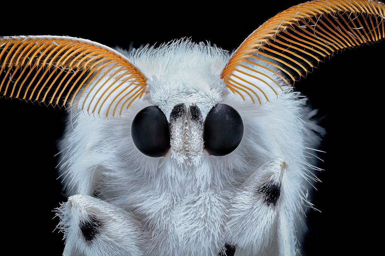 На снимке — крупный план головы белой бабочки с густым пушком и выразительными черными глазами. Яркие, изогнутые усы с оранжево-желтыми полосами создают контраст с темным фоном. Фотография передает удивительную детализацию и текстуру насекомого, подчеркивая его природную красоту. Работа Антона Орленко демонстрирует мастерство макросъемки и внимание к мельчайшим деталям.