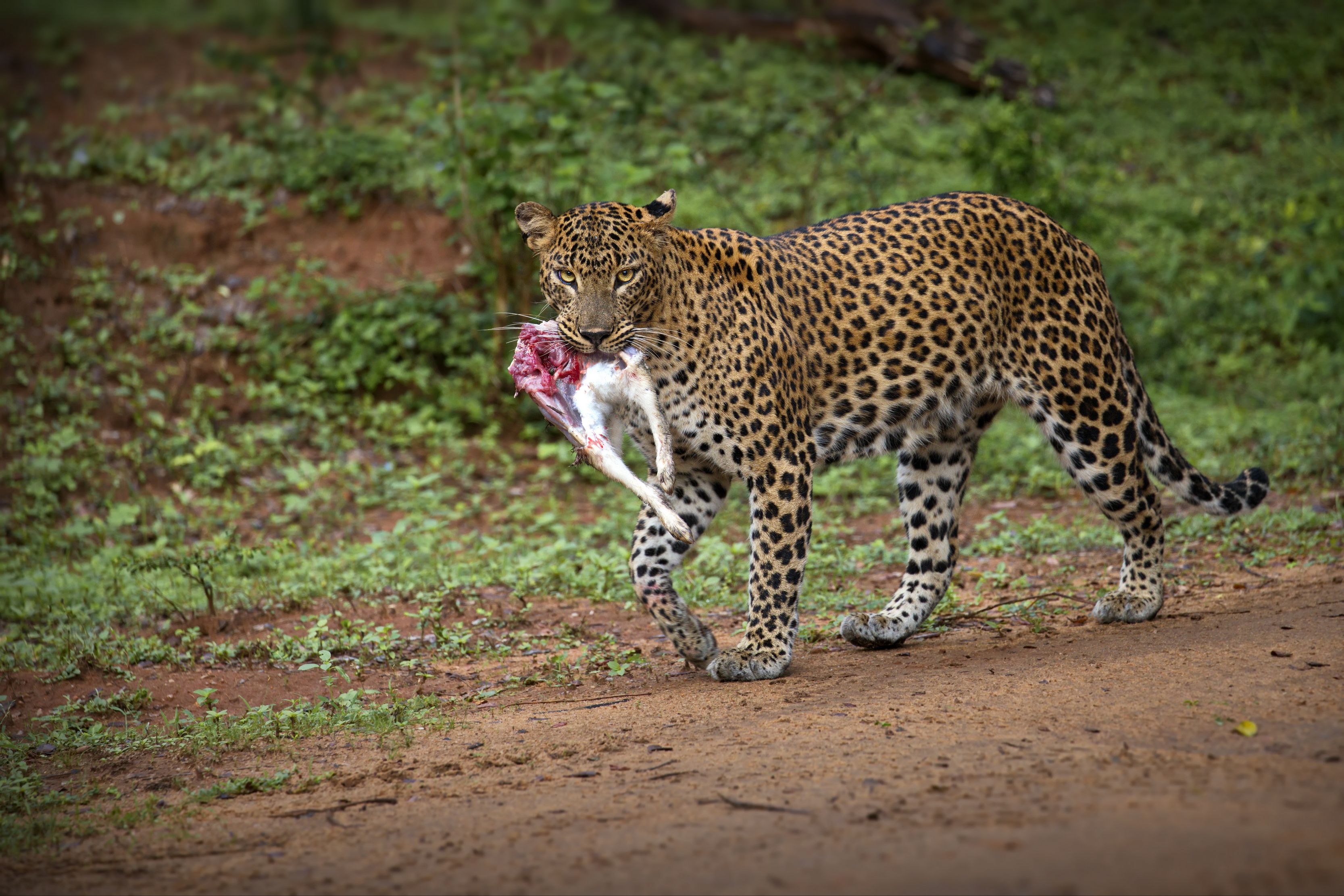В итоге представленные кадры в тот день сделал только наш экипаж. Остальные машины, поскольку просто сопровождали леопарда параллельно дороги, сгрудились позади него. Ситуационно леопард (вернее, леопардиха по имени Эмма) до этого метрах в 40 от дороги кого-то уплетал, а затем вальяжно на считанные секунды вышел из зарослей с оставшейся от своей трапезы половинкой туши кролика, и понес ее своим троим детишкам.