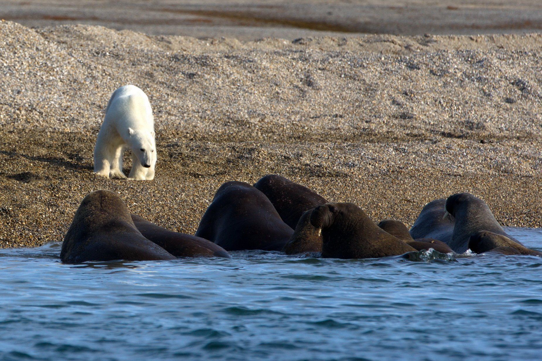 Учитывая, что даже небольшой морж крупнее белого медведя, последний редко когда приближается к лежбищу моржей, поскольку охота становится для него весьма неравной и рискованной. Рассчитывать в такой ситуации полярный медведь может главным образом на удачу, случайный захват старого или, наоборот, совсем молодого моржа. Учитывая, что детенышей остальные моржи прячут в случае опасности в середине лежбища, обычно такие сцены не заканчиваются ничем, кроме обзора и анализа возможных узких мест противника. Посмотреть, со вздохом облизнуться и печально ретироваться, - таков был исход и этого сближения.