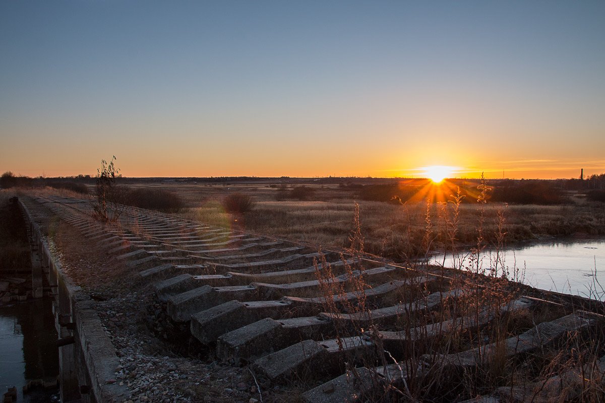 шпалы, рельсы, закат, мост, вечер, мороз, Александр