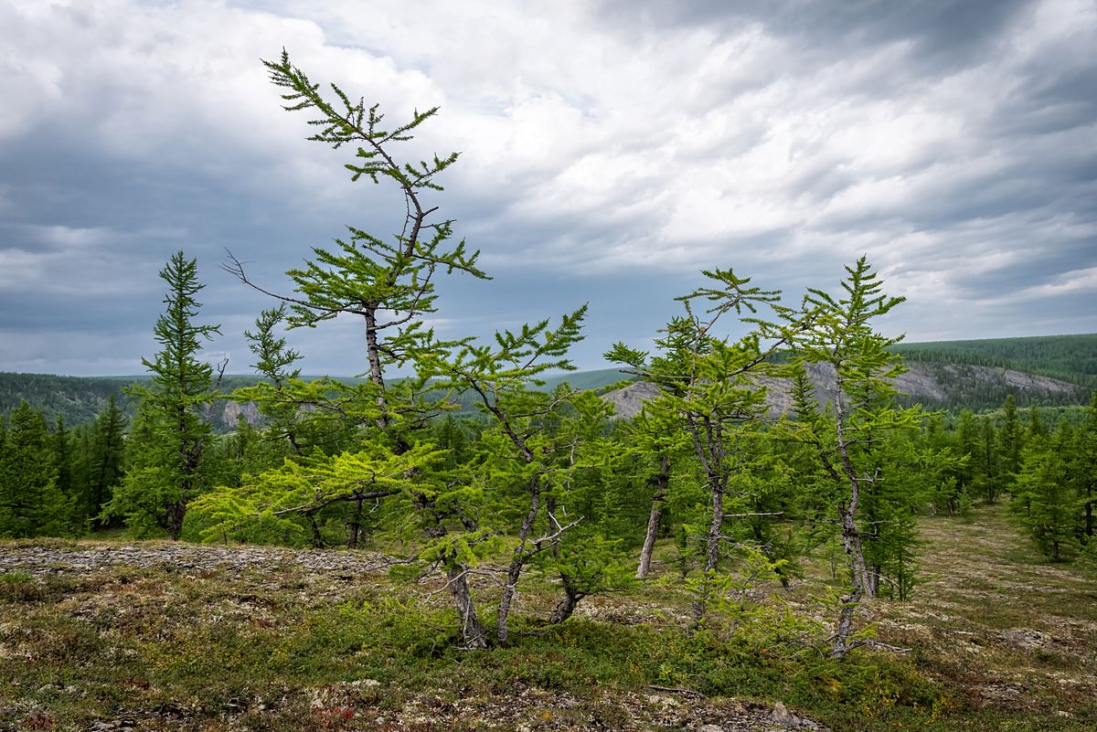 Фото из похода по рекам Балбанью и Кожим. На маршруте мы старались забираться на все более или менее интересные высоты. Тут мы уже спускались с очередной скалы и я бросил взгляд всторону от тропы. Эта группа лиственниц показалась мне довольно живописной несмотря на пасмурную погоду. И я решил сделать такой снимок.