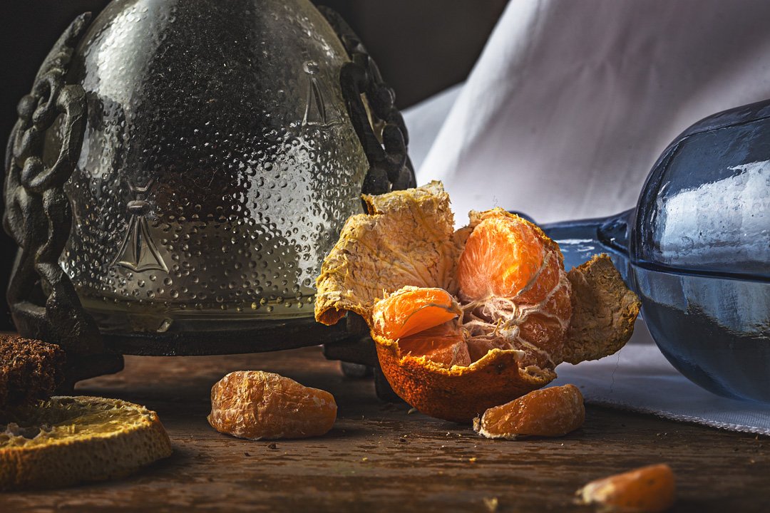 натюрморт, мандарин, цитрус, долька, апельсин, бутылка, стекло, вода, ткань, дерево, настроение, увядание, Станислав Аристов