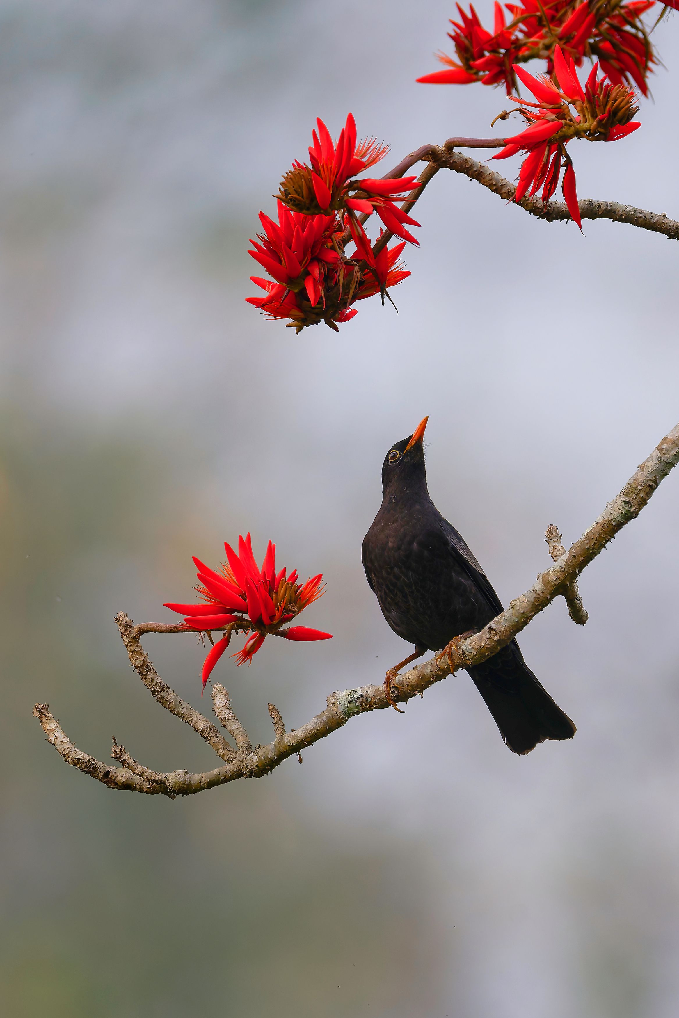 Эта фотография демонстрирует элегантную композицию с черным дроzdом, расположенным на изогнутой ветке. Ярко-красные цветы, вероятно, эритрины или подобные им виды, добавляют яркости и жизненной силы изображению. Птица выглядит спокойной, что позволяет рассмотреть детали ее оперения и позы. Нейтральный размытый фон помогает сосредоточить внимание на главном объекте — птице и цветах. Это типичный пример весенней природы, где цветение деревьев привлекает птиц. Фотограф Ramanuja Arjun успешно передал атмосферу спокойствия и красоты природы.