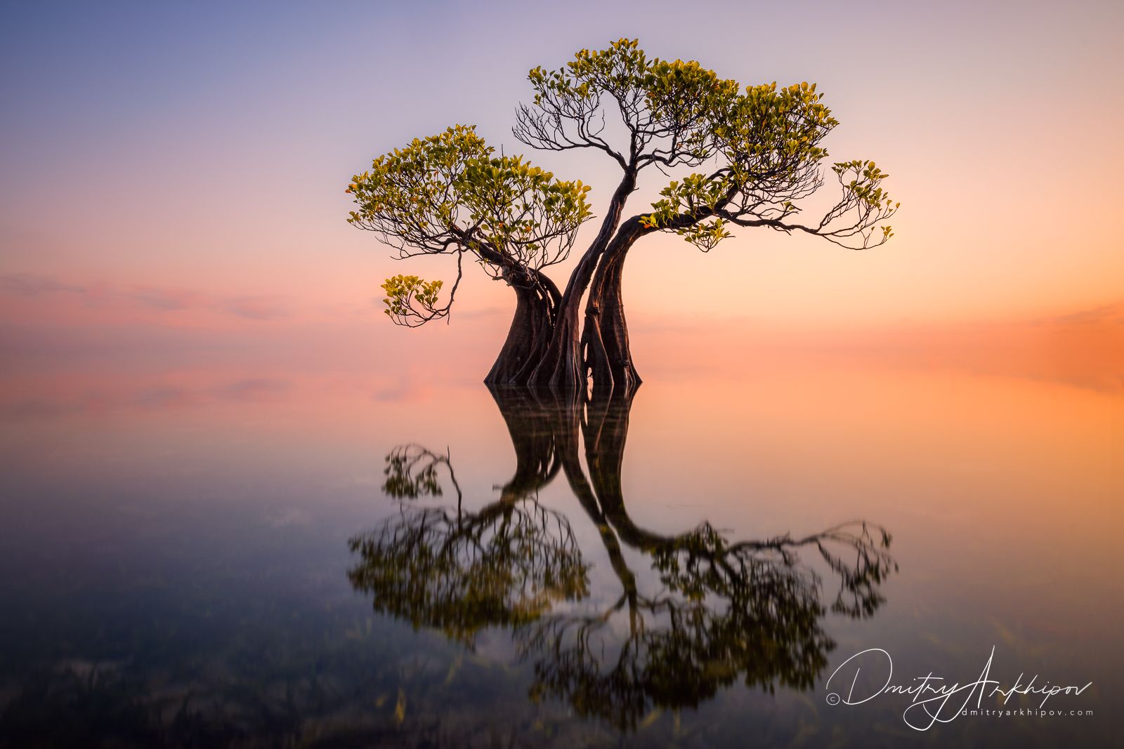 На фоне нежно-розового заката возвышается одинокое дерево, стоящее посреди спокойной воды. Его силуэт чётко отражается в гладкой поверхности, создавая симметричный и гармоничный образ. Сцена передаёт ощущение умиротворения и единения с природой. Фотография Дмитрия Архипова запечатлела момент, когда свет, вода и дерево сливаются в единое целое.