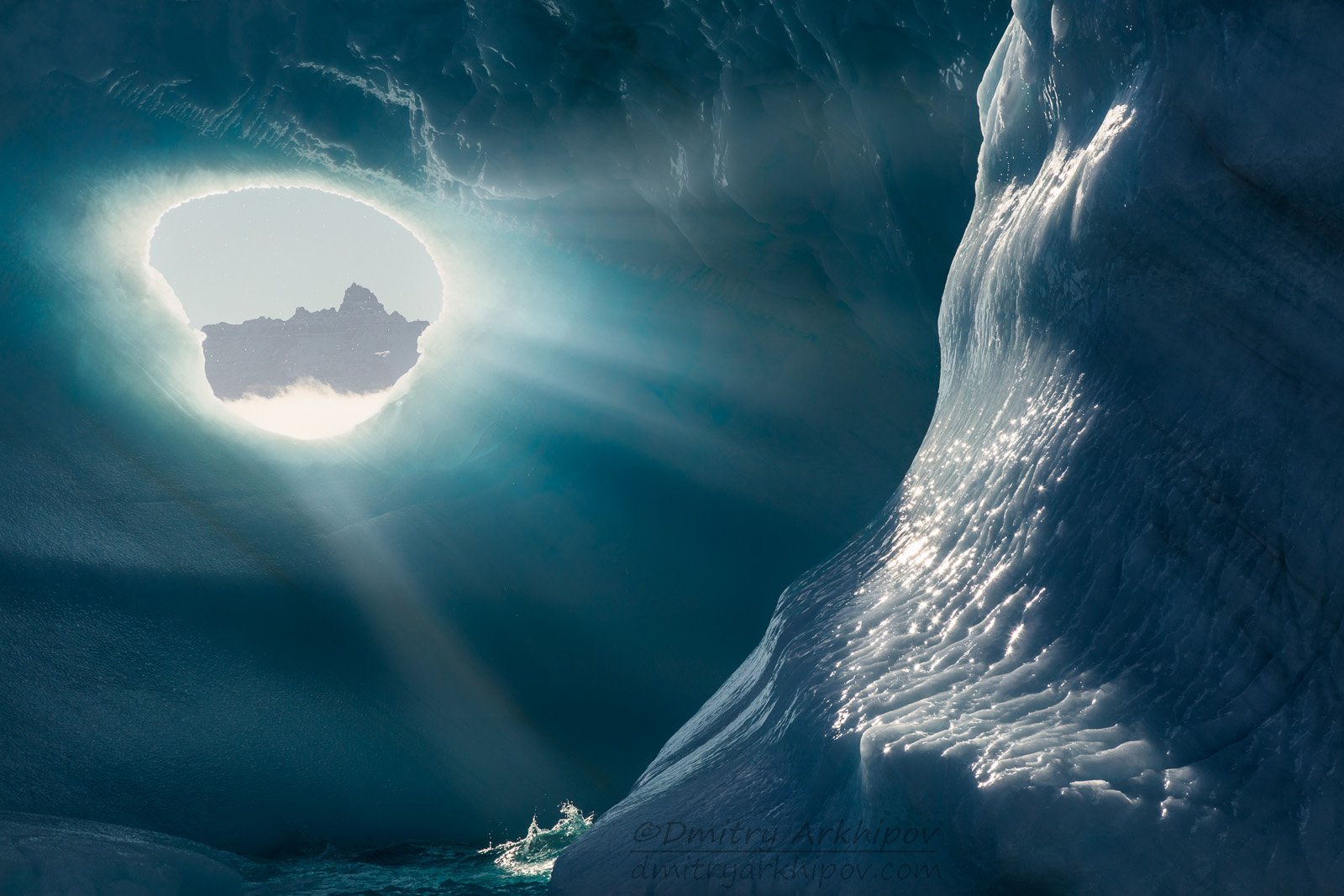 В глубине ледяной пещеры свет проникает сквозь естественную арку, образуя яркое свечение. Гладкие ледяные стены отражают лучи, создавая ощущение тишины и величия. Фотография передаёт холодную красоту арктических ландшафтов, где природа формирует удивительные архитектурные формы. Каждый луч — как приглашение в мир, скрытый под ледяным покровом.