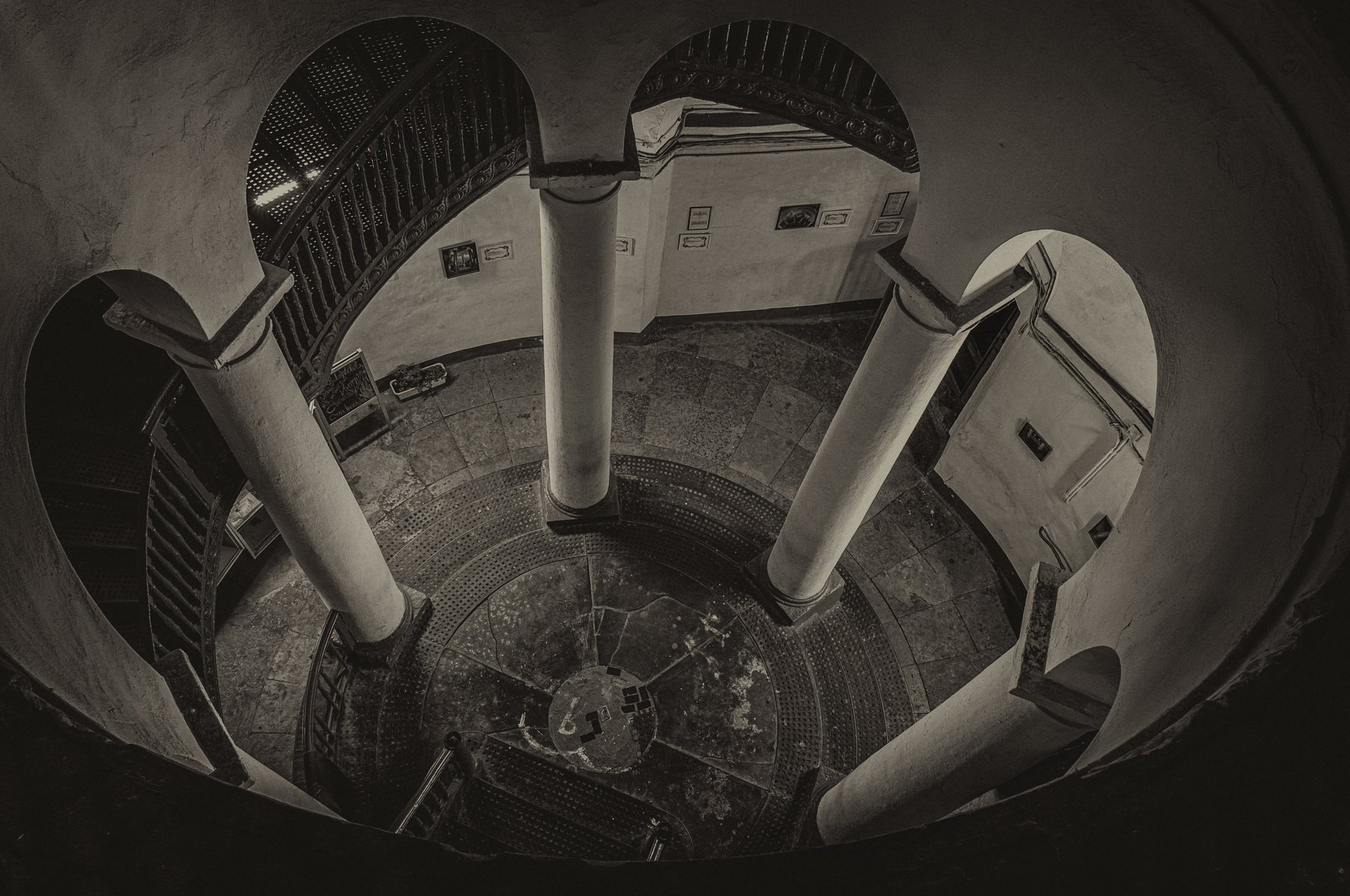 Ротонда внутри дома. Шесть колонн, расположенных по кругу парадной и увенчанных куполом, две винтовые чугунные лестницы, взбегающие вверх, небольшое окошко и маленький закуток наверху, к которому ведут несколько ступенек, оканчивающийся тупиком.