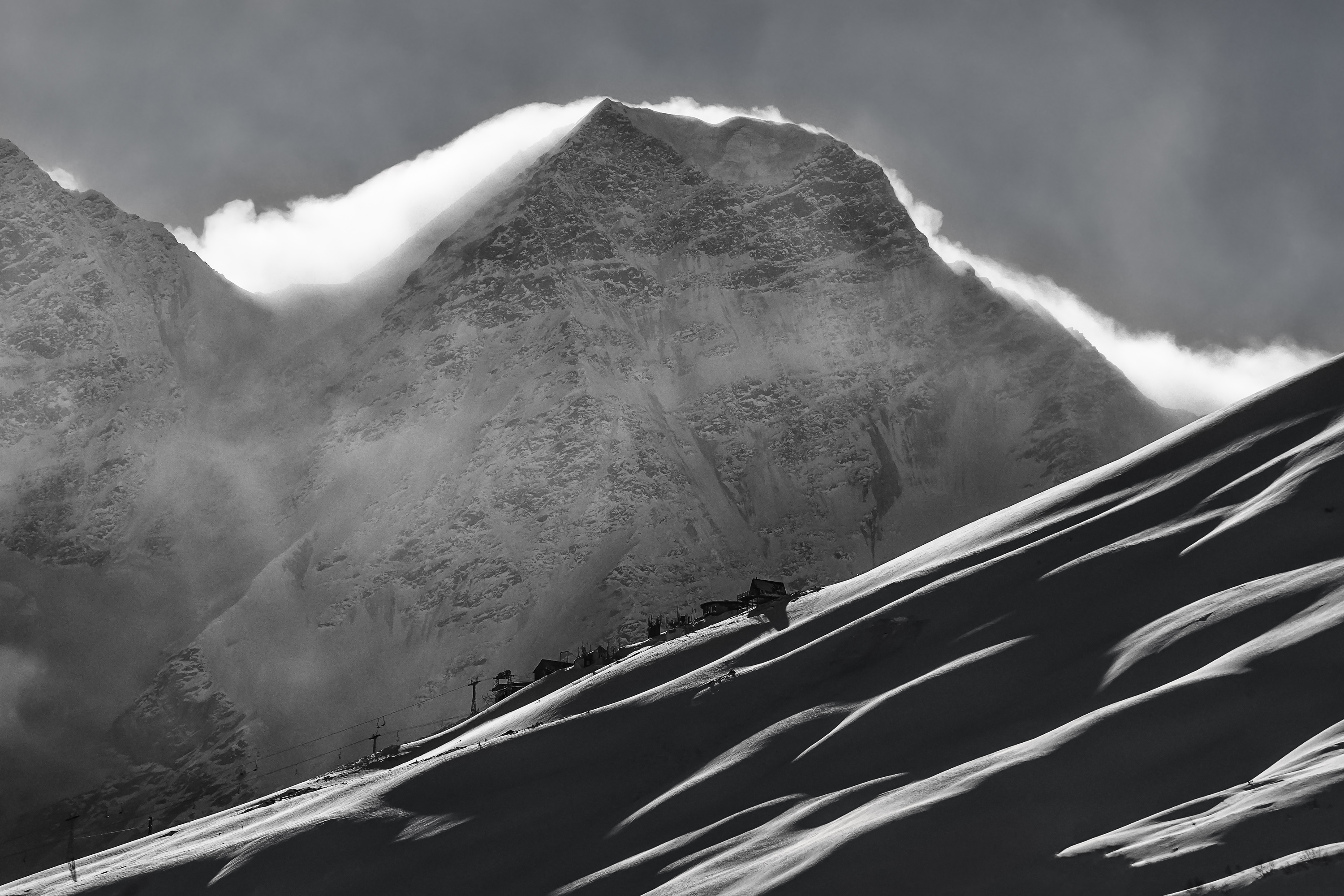 Снимок передаёт мощь гор — снежные линии, будто вырезанные ветром, и облака, обвивающие вершину, создают ощущение глубокого пространства. Чёрно-белое исполнение подчёркивает текстуру и игру света, особенно на склоне перед нами.