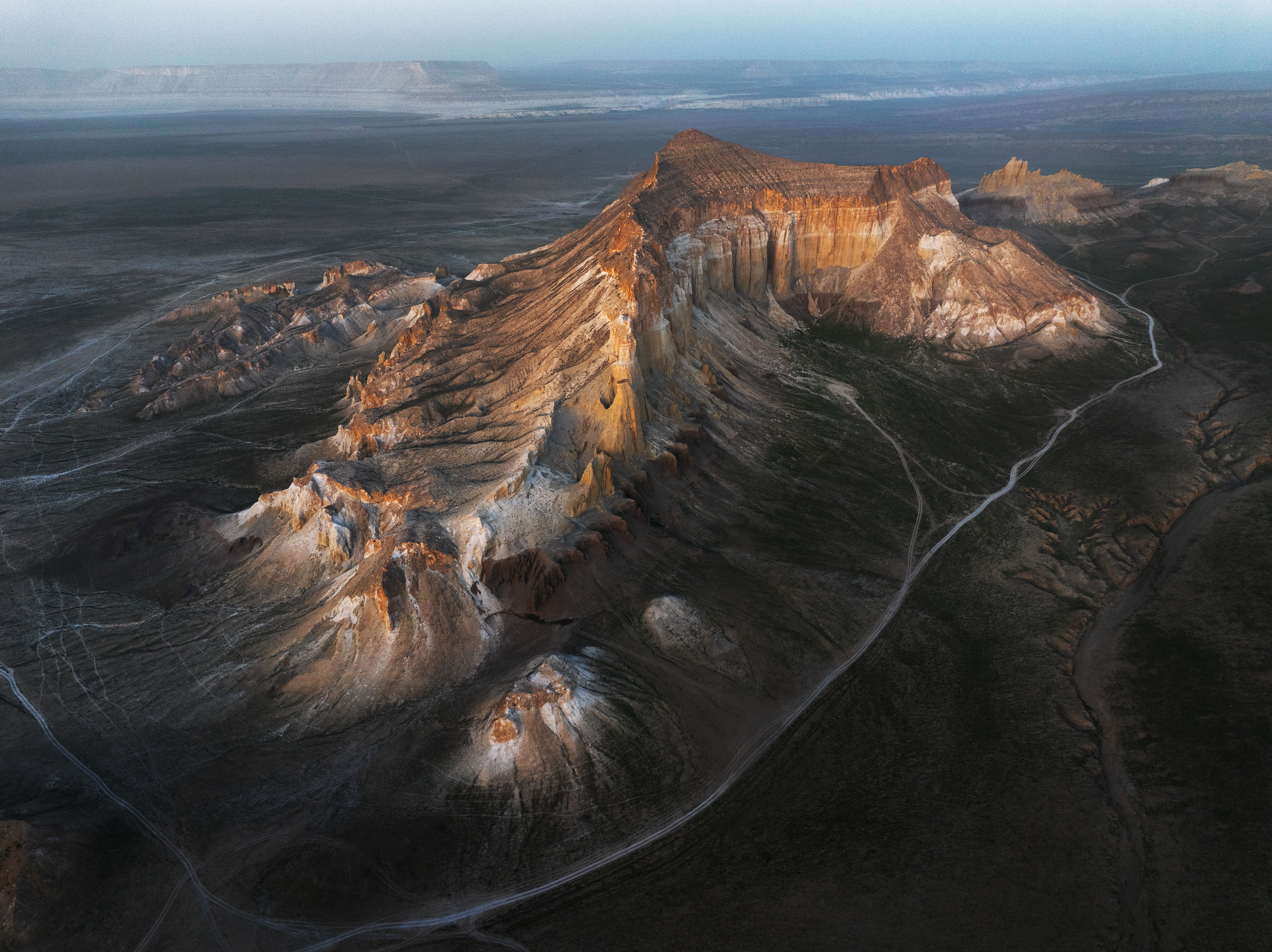 Аэрофотография Армена Майтесиана запечатлела суровую красоту пустынного ландшафта. Скальные массивы, выветрившиеся за тысячелетия, возвышаются над бескрайними равнинами. Утреннее солнце, падающее под низким углом, подчеркивает рельеф, создавая драматические тени и золотистые отблески на вершинах. Извилистые тропы, проложенные по склонам, напоминают о присутствии человека в этом диком пространстве. Фотография передаёт одновременно величие и уединённость природы.
