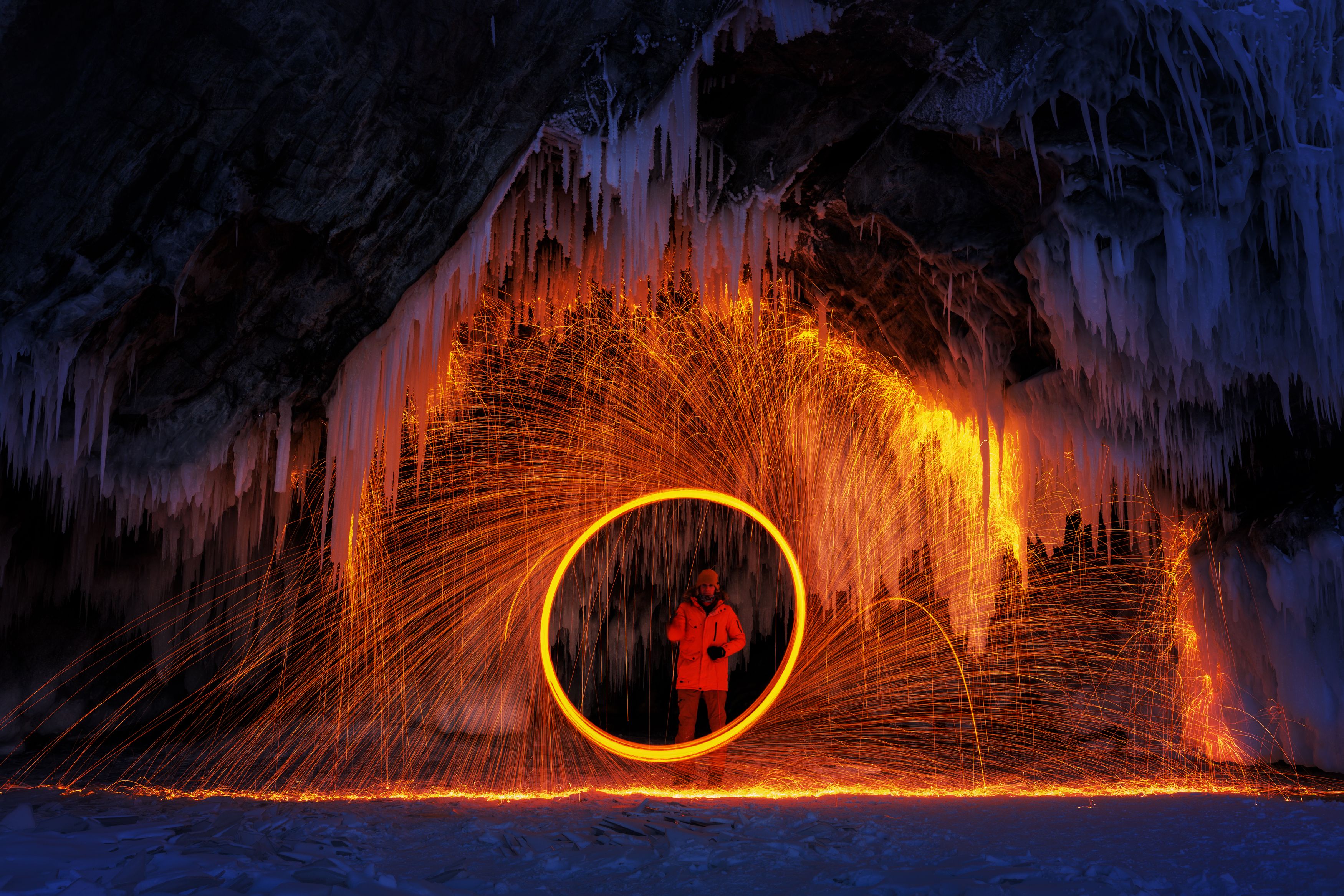 Интересная работа, Армен. Световая композиция с искрами и кругом создаёт сильный визуальный акцент, особенно на фоне ледяных сталактитов. Хорошо выдержан баланс между теплыми и холодными тонами.