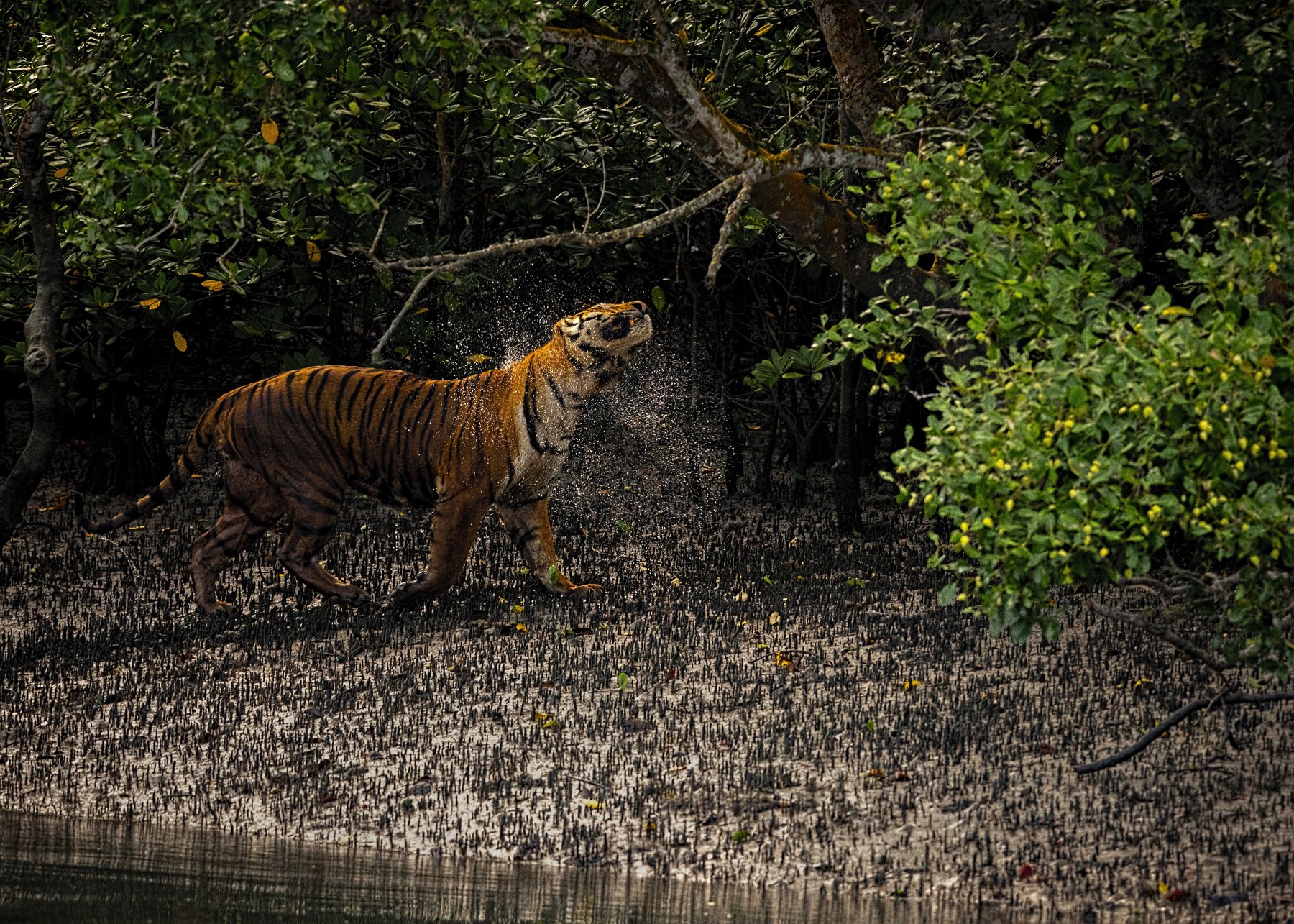 Description - The majestic Bengal Tiger shaking off water after crossing the river while walking on a thorny path of the mangroves. Seeing the endangered Bengal Tiger in the huge mangroves is very rare where they lead a very difficult life, tracking a very little prey base while hoping from island to island, drinking saline water and avoiding the growing human population.