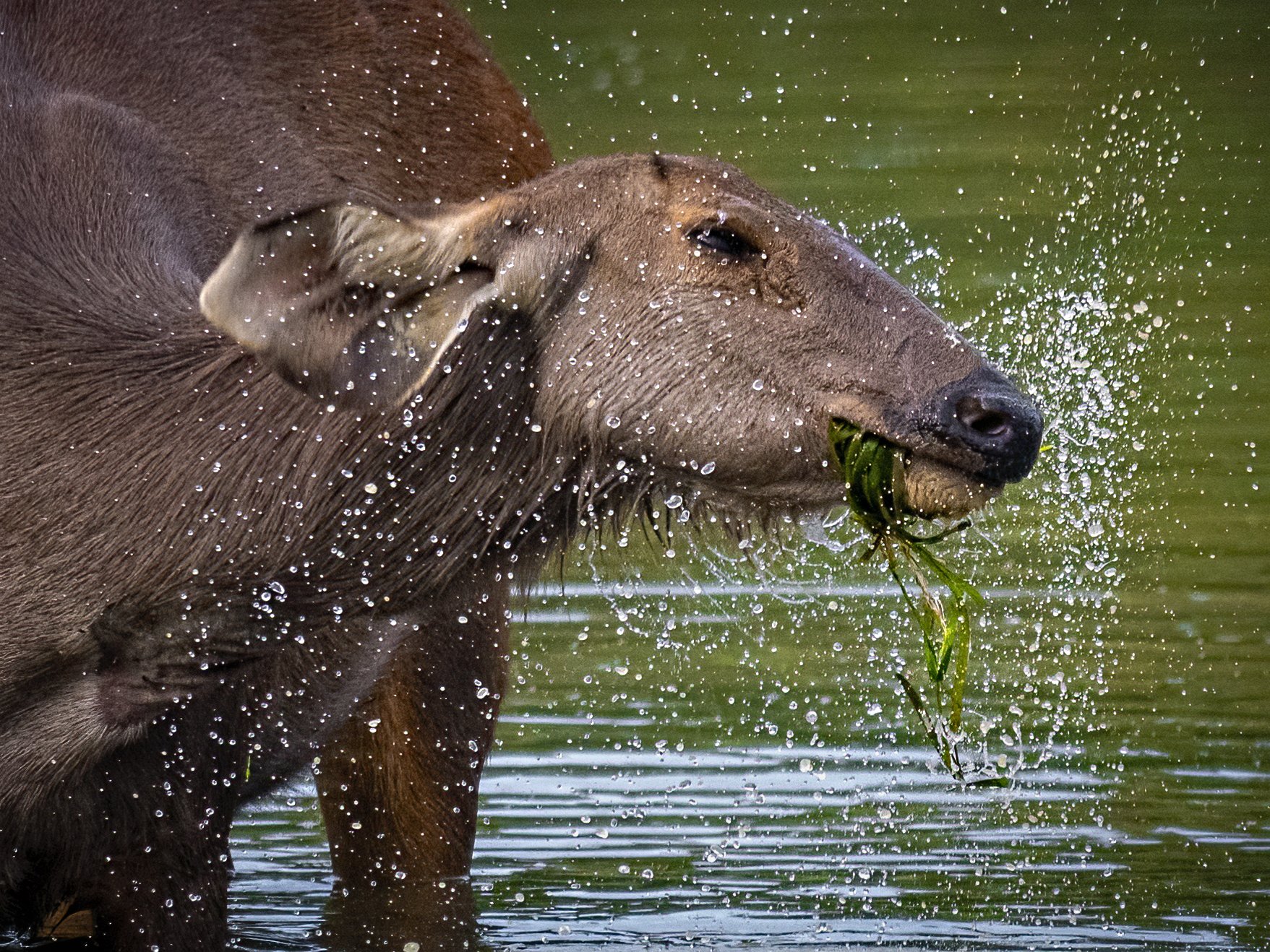 Description - A Sambar Deer was dipping its head inside water to munch on aquatic grasses. After getting a mouthful, it raised its head and shook off the water from its face.
