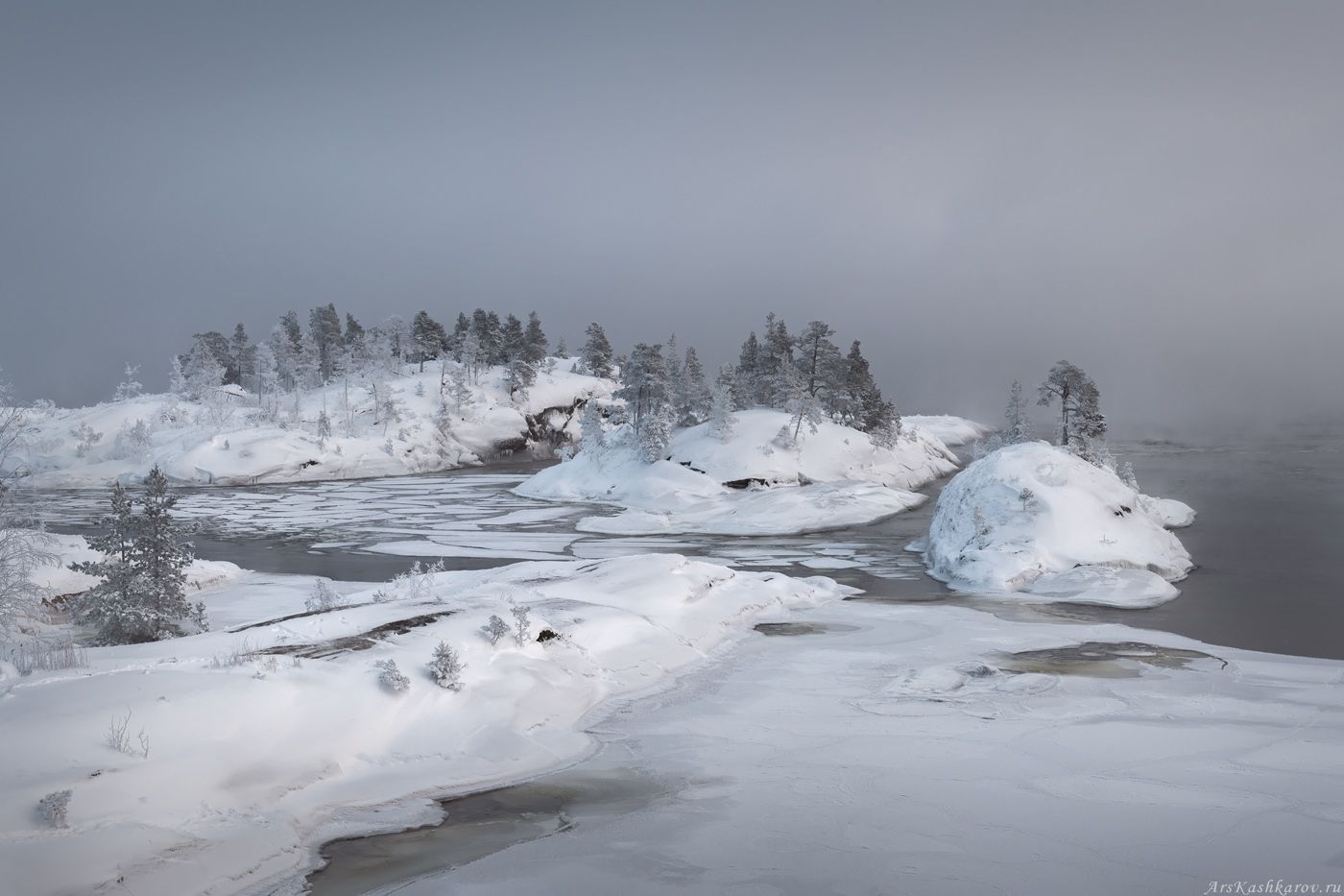 Из-за больших глубин и неспокойного характера, Ладога замерзает отнюдь не сразу, даже если мороз 30 градусов. Белоснежные острова остаются окруженными водой и льдинами