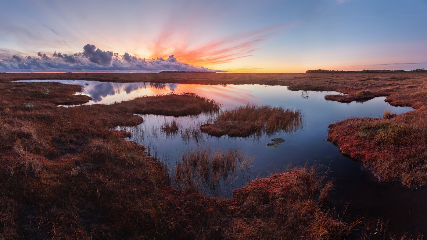 Середина октября. В завершении пасмурного дождливого дня облака расступились, и мягкий свет вечерних сумерек заполнил топкую равнину. Снимок сделан во время путешествия по одному из крупнейших болотных массивов Европы на востоке Ленинградской области