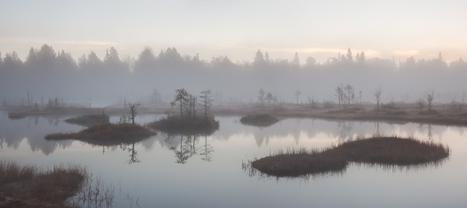 Над осенним болотом густой туман. Полный штиль. Кое-где уже блестят следы первой изморози. Краски зари уже пропали, и мир сказочных топей замер в ожидании первых лучей восхода. Где-то среди бескрайних болот, на востоке Ленинградской области