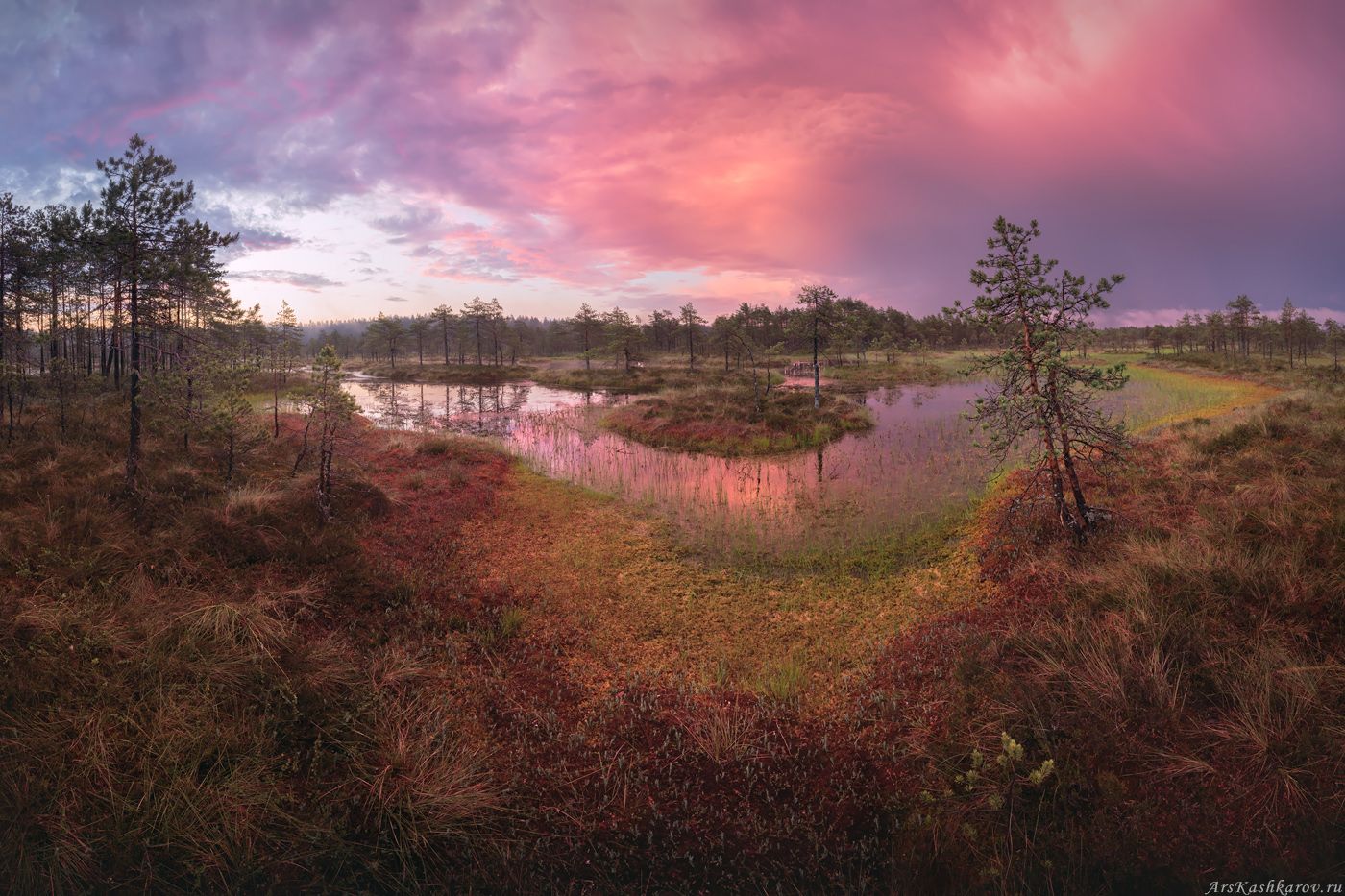 Записываясь ко мне в туры, люди часто спрашивают: "Какая будет погода?" Ответить на такой вопрос затруднительно. Во время одного из летних болотных туров прогноз обещал ясную солнечную погоду и ни единого облачка все два дня — не самый лучший расклад для фотографа. Однако ночью начался дождь с грозой, который лил часа три. К рассвету буйство стихии прекратилось, и нас ждал потрясающий красочный восход