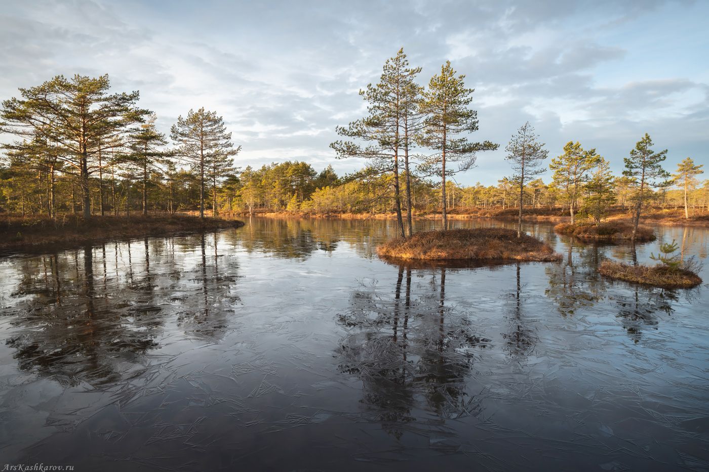 В период с октября по январь на болотах можно застать удивительные переходные состояния природы, когда зима ещё не наступила, а осень не торопится уходить: первый снег, первый лед, изморозь, зимний туман. После сильных ночных заморозков болотные озерки затянулись тонким фактурным льдом. Приглашаю в фототуры на болота выходного дня