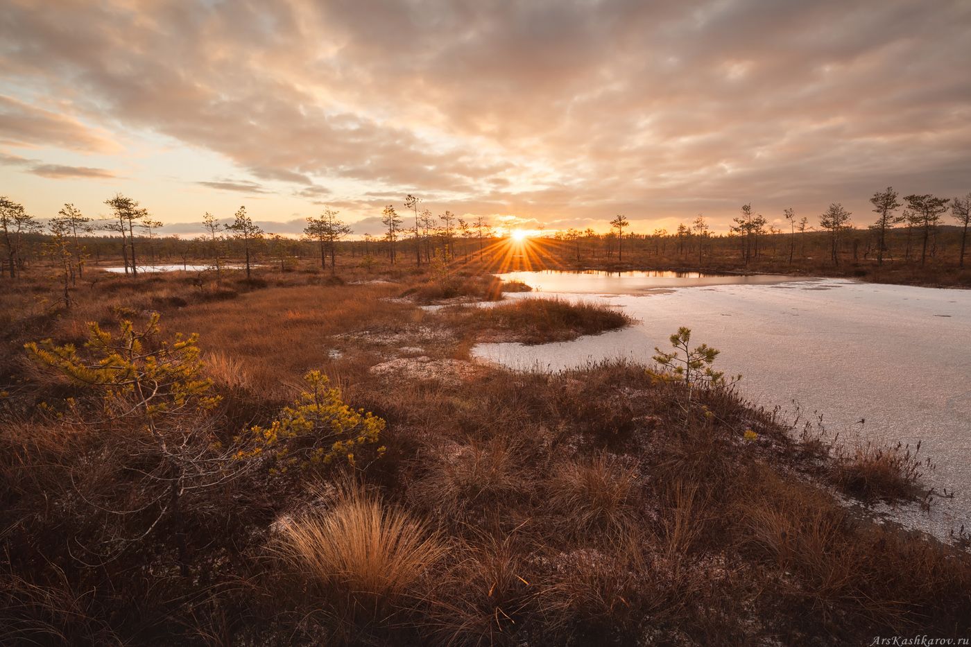 Во время оттепели после схода снега болота выглядят желто-бурыми и безжизненными. Пожухлые травы, красно-бурые мхи. За время зимы "вечнозеленые" кустарнички теряют хлорофилл и перестают быть зелеными. Даже хвоя болотных сосен становится желтовато-рыжей