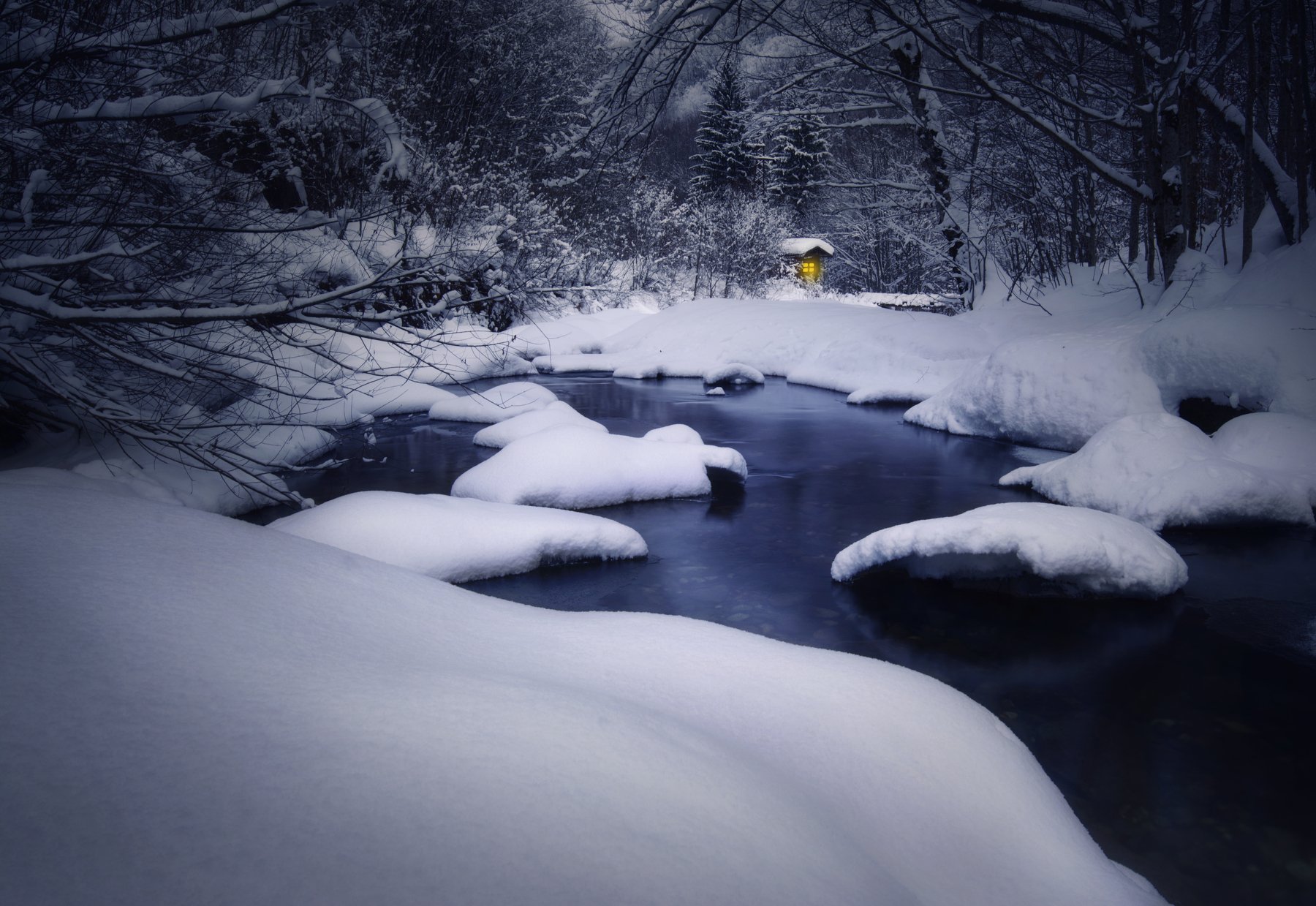 landscape, nature, snow, river, hut, пейзаж, природа, Genadi Dochev