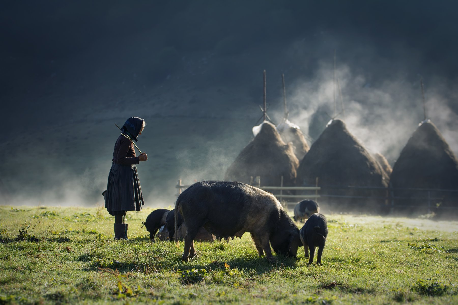 rural, idyll, landscape, village, mountain, river, sunrise, light, spring, pigs, Genadi Dochev