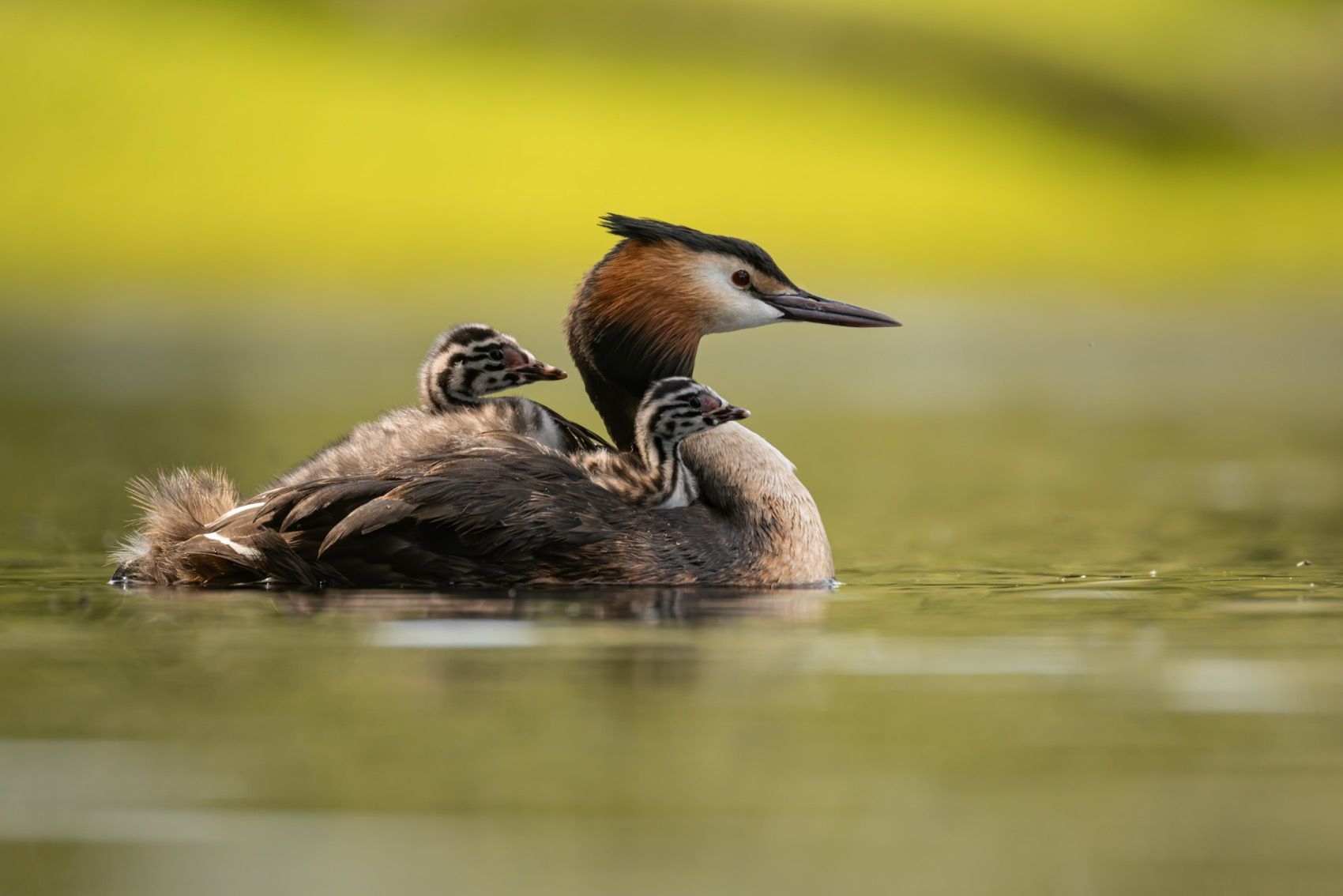 На фоне мягкой зелени берега чомга с двумя птенцами на спине спокойно плывёт по воде. Каждый птенец уютно устроился, доверяя своей матери. Сцена передаёт гармонию и нежность в животном мире, где забота и защита — главные ценности. Фотография захватывает момент, когда природа раскрывается в своей самой искренней и трогательной форме.