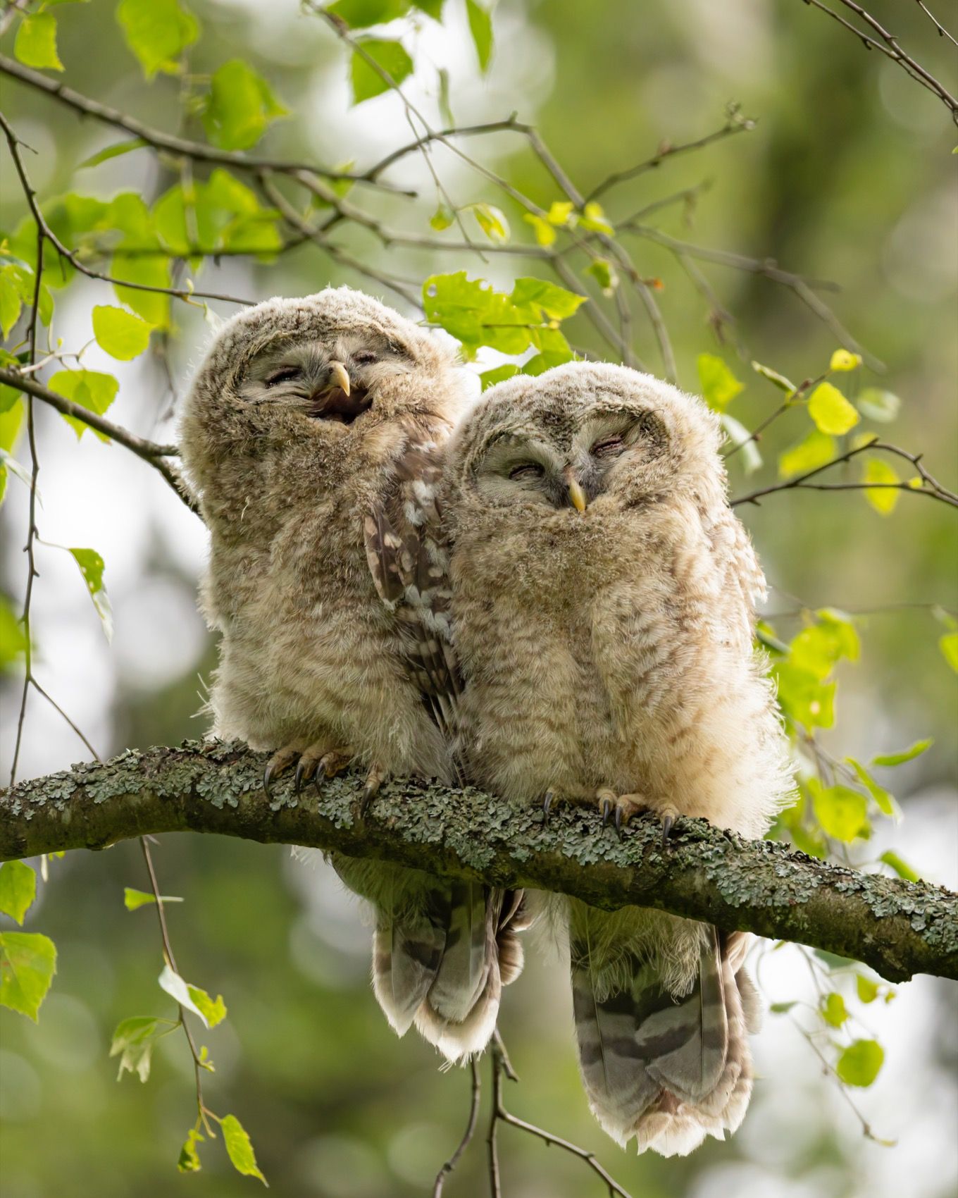 На ветке среди свежей листвы уютно расположились два совенка — вероятно, уральской или длиннохвостой неясыти. Их пуховое оперение и полуприкрытые глаза создают ощущение нежности и покоя. Сцена передаёт тихую гармонию лесной жизни, где молодые птицы находят укрытие и тепло в преддверии ночи. Фотография запечатлела момент спокойствия в дикой природе.