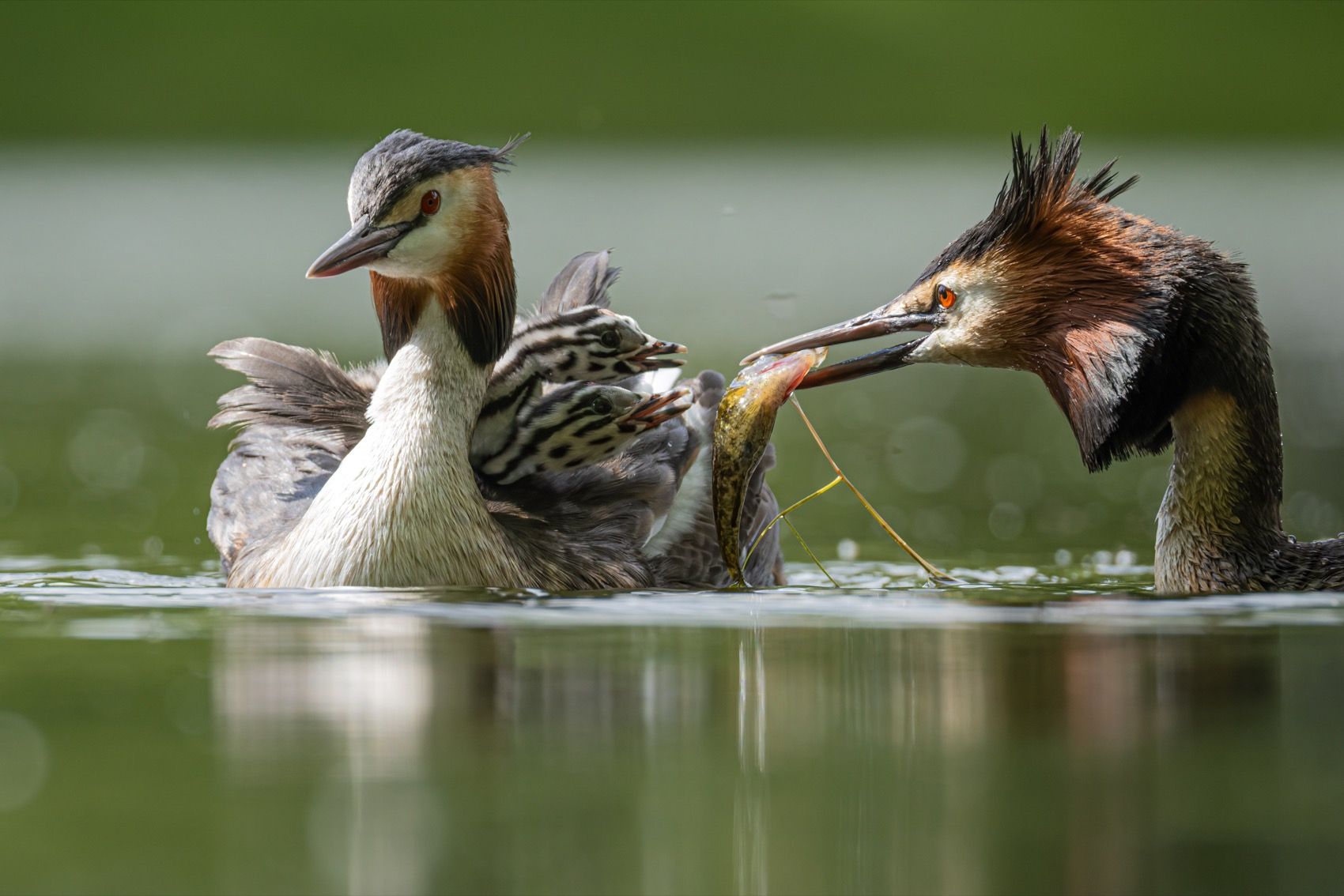 На спокойной воде большая поганка, или чомга, подносит птенцам добычу — вероятно, рыбу или насекомое. Птенцы, с серо-коричневым оперением, внимательно следят за родителем. Сцена передаёт естественный процесс выживания и заботы в дикой природе. Фотография запечатлела момент, когда птица демонстрирует инстинктивное поведение, характерное для водоплавающих птиц.
