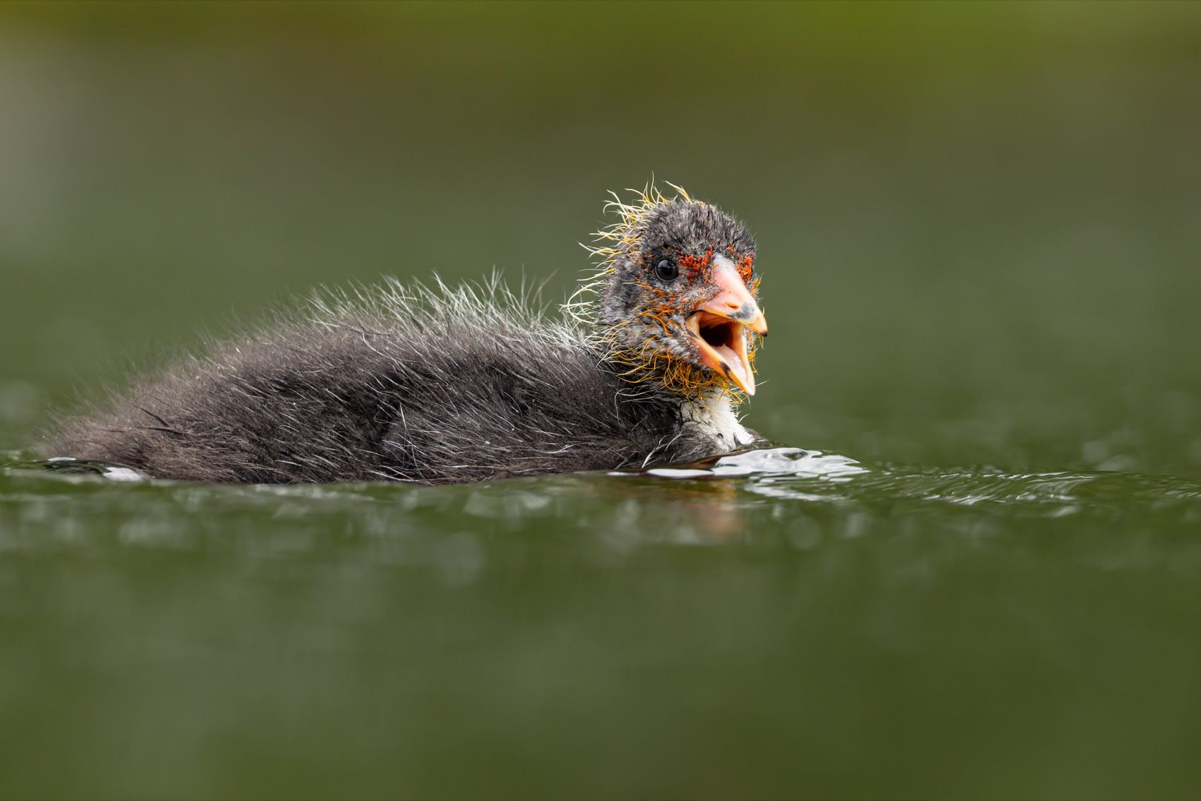 На снимке — маленький лысенок, плывущий по зеленоватой воде. Его пух мокрый, клюв открыт, словно он зовёт на помощь. Сцена передаёт уязвимость и тревогу дикой природы. Фотография запечатлела момент, когда птенец, возможно, потерялся от родителей. Кадр напоминает о хрупкости жизни в природе и о важности заботы о дикой фауне. Фото Руслан Pl.