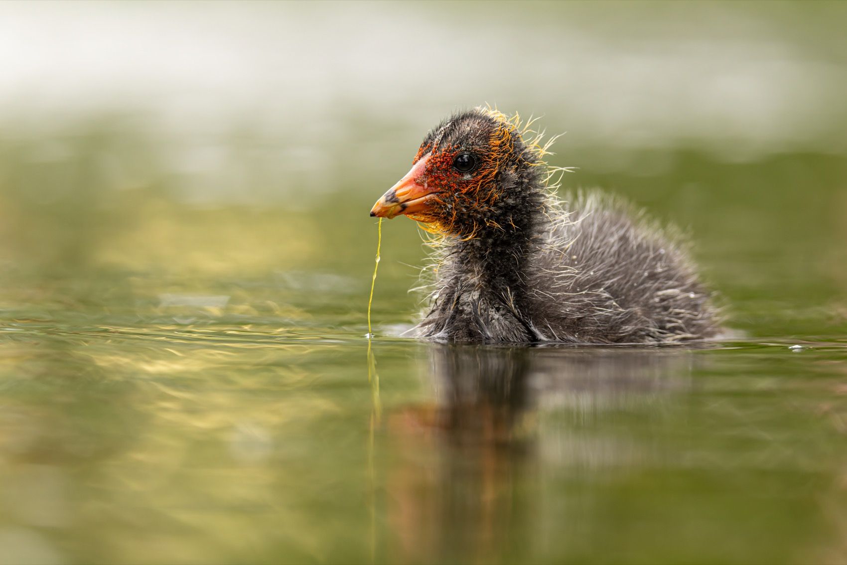 На тихой глади воды плавает маленький лысенок — птенец лысухи, чьи пушистые перья едва касаются поверхности. Его оранжевый клюв и чёрные глаза смотрят вдаль, будто он уже задумывается о будущем. Фотография передаёт тишину и умиротворение дикой природы, где каждый момент — это начало новой жизни. Работа Руслана Pl. — это не просто снимок, а кадр из сказки.
