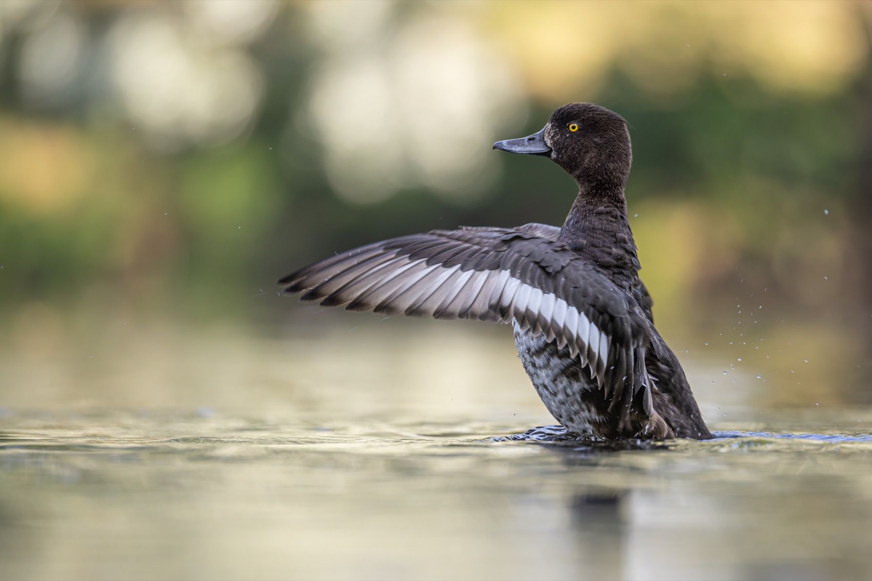 В тихом водоёме хохлатая чернеть, птица из семейства утиных, расправляет крылья, словно готовясь к взлёту или распределяя перья после плавания. Солнечный свет мягко освещает её тёмное оперение, подчёркивая контраст белых полос на крыльях. Кадр передаёт гармонию и естественность дикой природы, где каждое движение — часть жизненного ритма.