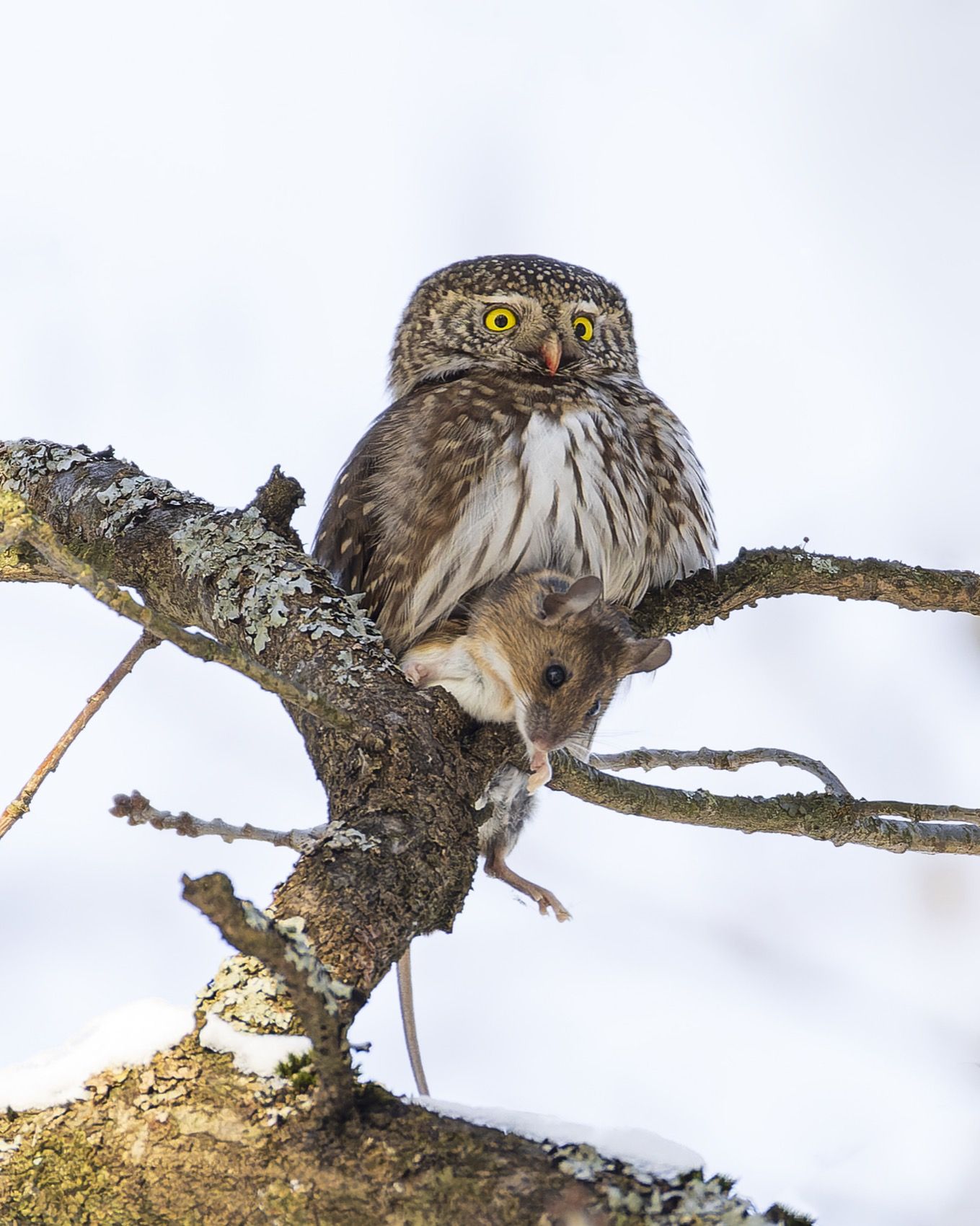 На снимке — воробьиный сычик, удерживая в когтях пойманную мышь, сидит на обледенелой ветке. Зимний фон подчеркивает драматизм момента. Птица, несмотря на маленькие размеры, демонстрирует острый взгляд и напряжённую позу — типичные черты хищника в момент охоты. Фотография передаёт естественный баланс экосистемы и инстинктивное поведение совы в дикой природе.