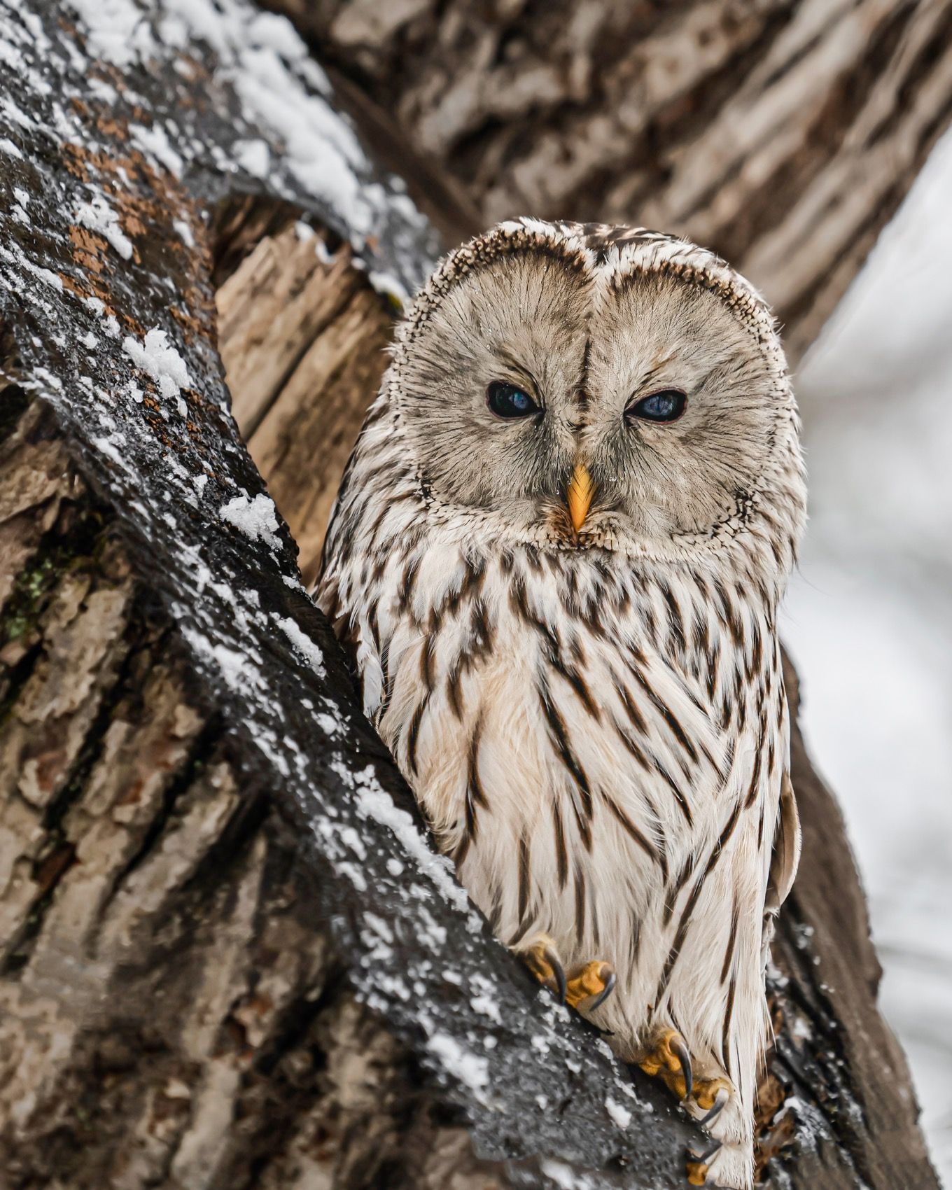 На снимке — длиннохвостая неясыть, птица, обитающая в тайге и смешанных лесах Урала и Сибири. Её бело-коричневое оперение с чёткими полосами идеально маскирует в зимнем лесу. Острый клюв и тёмные глаза выдают хищника, готового к охоте. Фотография передаёт атмосферу холодного дня: снег на ветвях, грубая кора, сосредоточенное выражение птицы. Работа Ruslan Pl. — яркий пример природной фотографии, захватывающей момент в естественной среде обитания.
