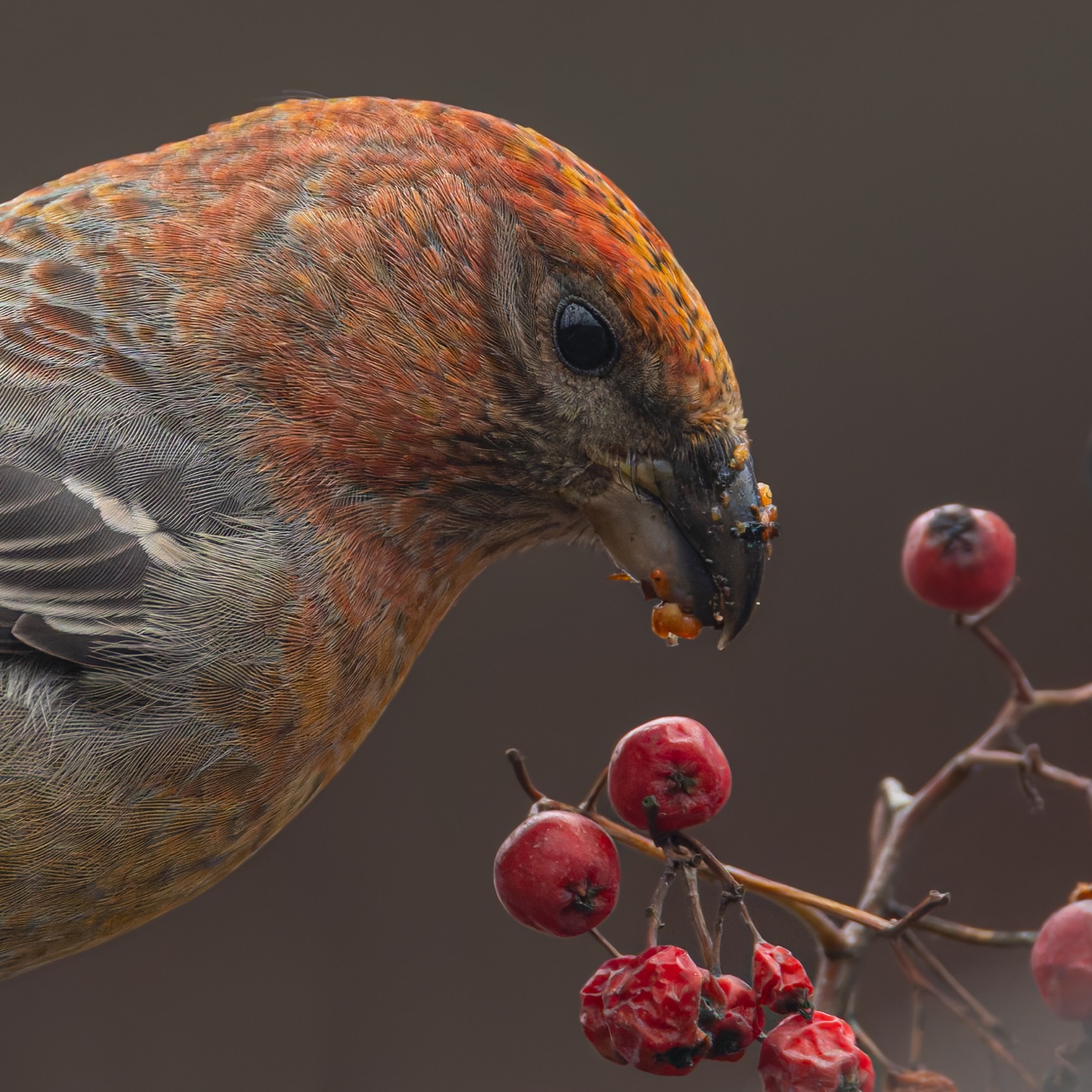 Щур в кадре — живой, сосредоточенный, с ярким оперением и чётким акцентом на клюве, полном ягод. Хорошо передан момент кормления, фон мягкий, птица — в фокусе.