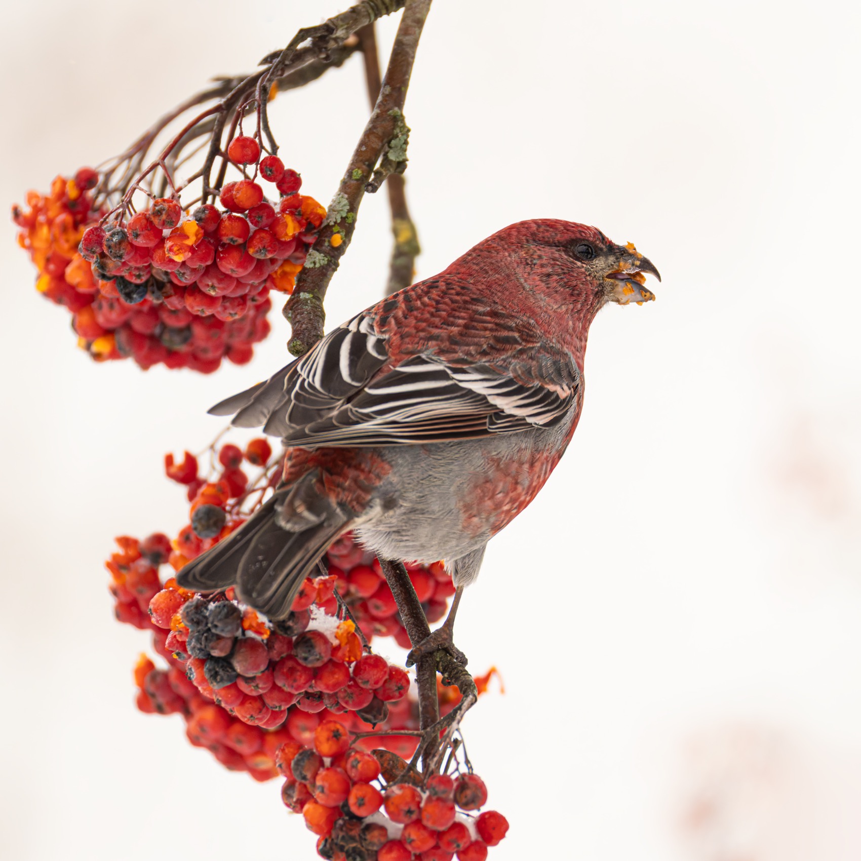 Красивый кадр — щур на рябине, яркие ягоды, чёткая деталь. Птица в движении, будто только что схватила ягоду. Свет мягкий, фон чистый — всё смотрится естественно и живо. 🐦🍂