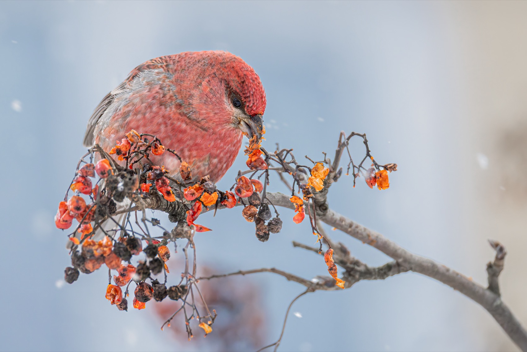 Свет мягкий, фон размыт — птица выделяется чётко. Рябина в красно-оранжевых оттенках контрастирует с серым ветвистым фоном. Щур сидит спокойно, клюв у него уткнут в ягоду — момент естественный, почти незаметный. Хорошо передано ощущение зимнего дня, когда всё замерло, а птица — в движении.