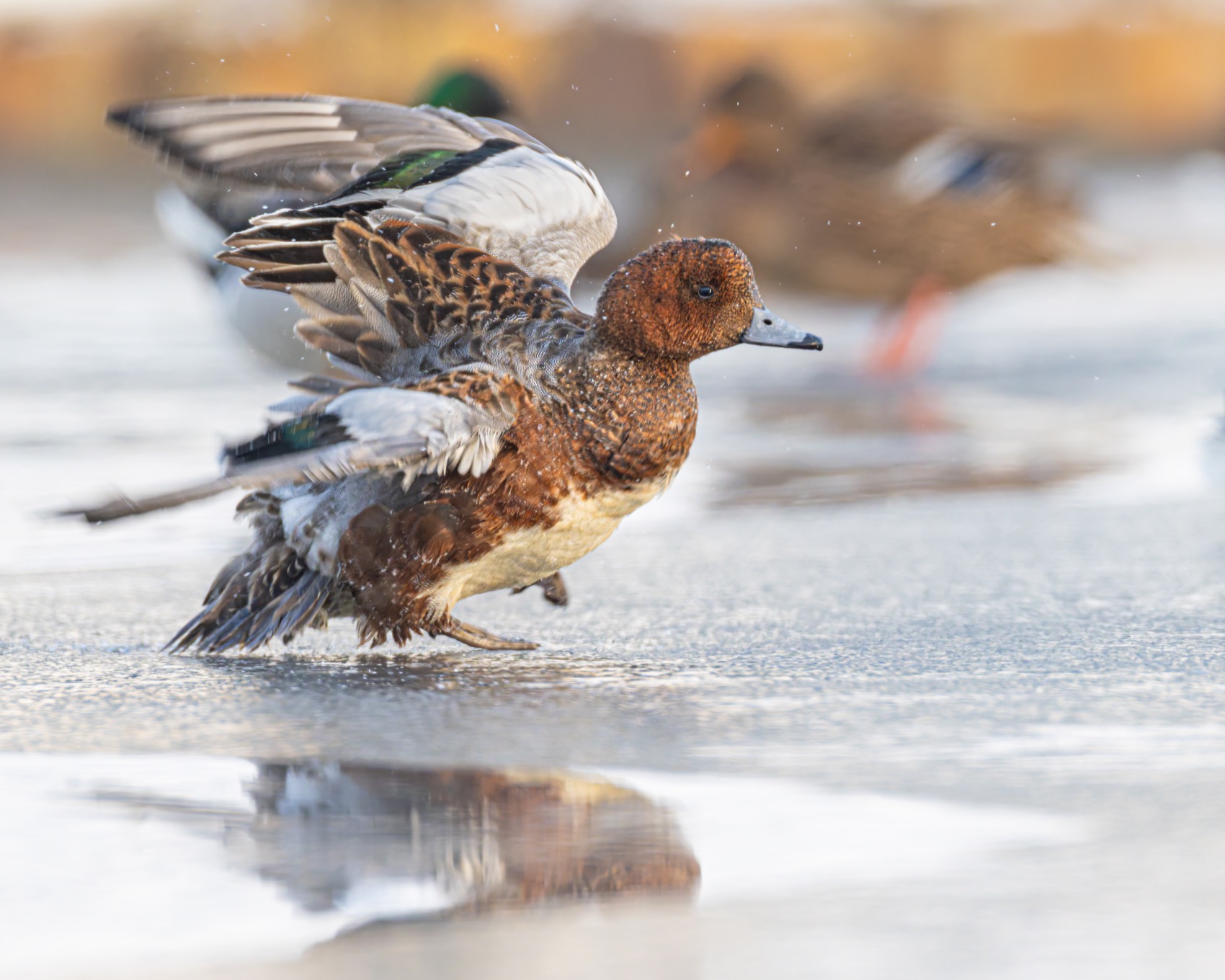 Свиязь на льду — динамичный кадр, захватывающий момент неудачного шага. Хорошо передано движение, детали оперения, брызги, отражение. Фокус чёткий, фон мягко размыт. 🦆❄️