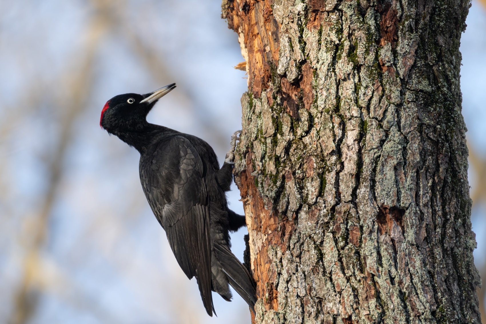 Снимок получился чётким — дятел на дереве, почти в профиль, хорошо видны детали: чёрное оперение, красный шапочник, крепкие лапы на коре. Фон мягкий, не отвлекает. Красиво, живо, как будто птица вот-вот начнёт стучать.