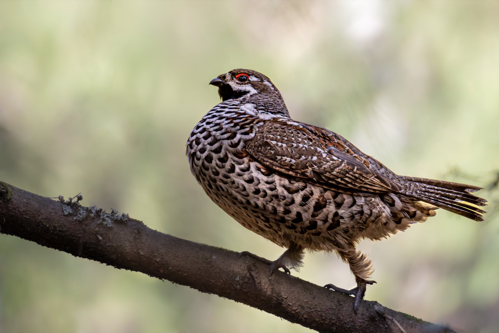 Хороший кадр рябчика на ветке. Освещение естественное, фокус чёткий. Птица в профиль, поза естественная. Фон мягко размыт, не отвлекает. Можно чуть больше света на брюшной стороне — контраст чуть сильный. В целом, достойный снимок.